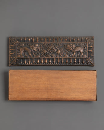 Whether used to encase sacred texts or as a display piece, this Tibetan scripture book cover brings authenticity and meaning to your altar, meditation corner, or collection. Its compact form and powerful detailing make it a treasured item for spiritual practitioners and collectors alike. This copper and wood scripture protector is a rare find for anyone seeking an authentic connection to Tibetan Buddhist heritage.