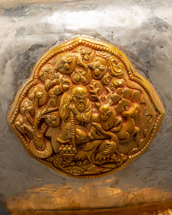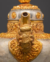 This handcrafted traditional teapot combines art and functionality. Standing 39cm tall and weighing 3.35kg, it is a stunning representation of craftsmanship. Made from copper, it features silver plating and gold plating for an opulent touch. The intricate dragon handle on the teapot's body adds a layer of cultural and spiritual significance, making it not just a functional teapot but a symbol of tradition and prosperity.