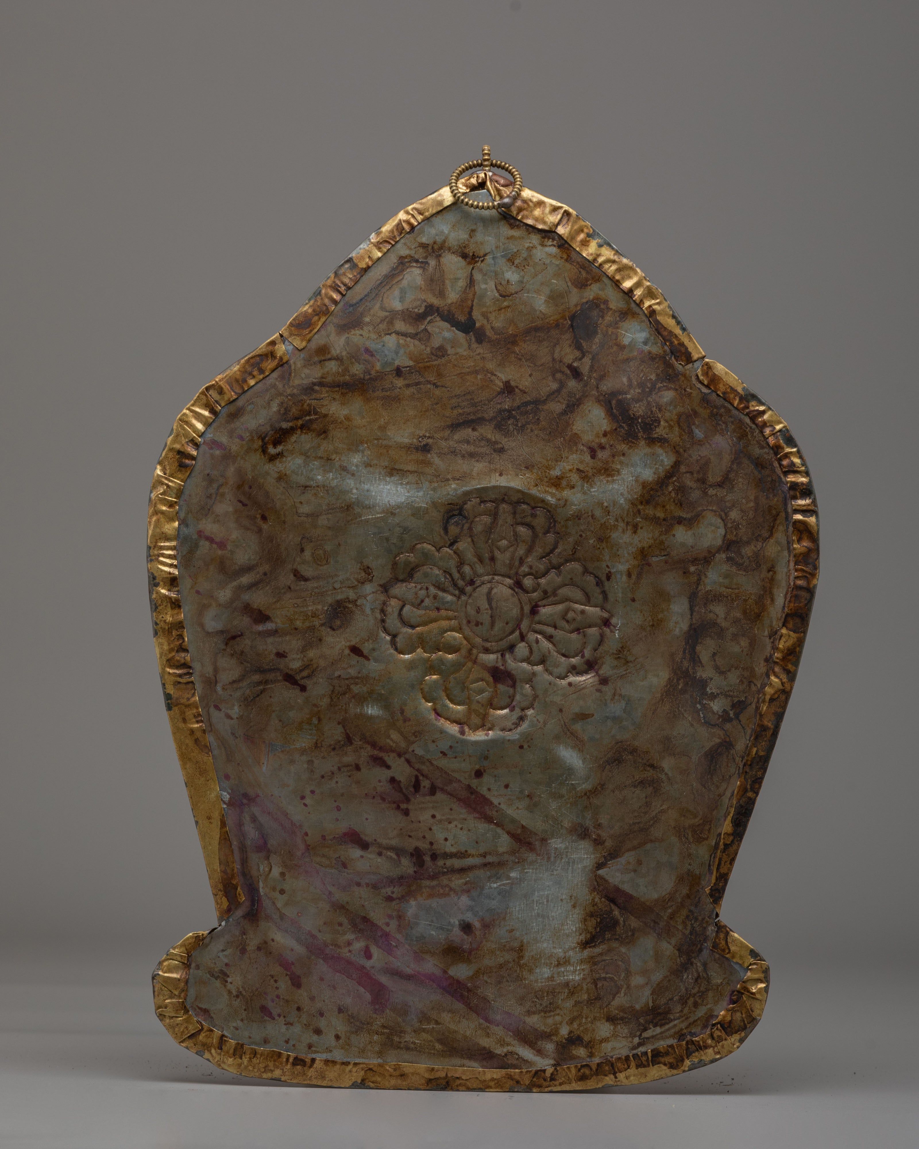 A metal thangka is a type of thangka painting created on a metal surface, distinct from traditional canvas or paper. These thangkas are typically crafted from copper, brass, or silver and feature intricate designs and Buddhist iconography using a repoussé technique. This process involves hammering the metal from the reverse side to create a raised relief image on the front. Metal thangkas are renowned for their durability and are often used in ritual contexts or as decorative items in Buddhist homes and temples. They are particularly common in Tibet, where they have been produced for centuries.
