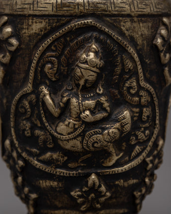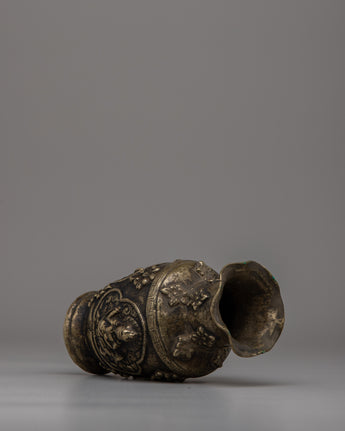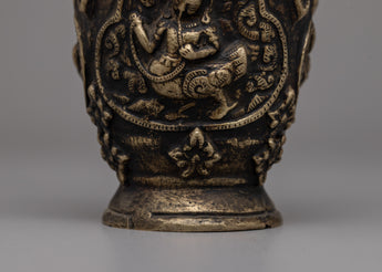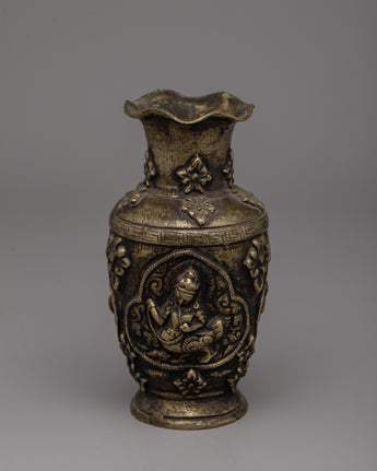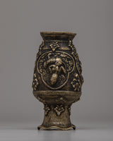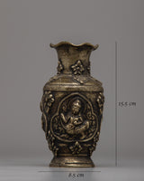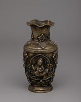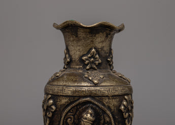 This Hand Carved Single Flower Vase is a gorgeous piece of craftsmanship, masterfully constructed from a brass body with an antique finishing for a timeless appearance. The vase's exquisite design incorporates a portrayal of a Buddhist deity and traditional Buddhist artwork, resulting in a beautiful blend of devotion and beauty. Its 15.5 cm height and 8.5 cm breadth make it ideal for displaying a single, eye-catching blossom or as a decorative piece in your home or sacred space.