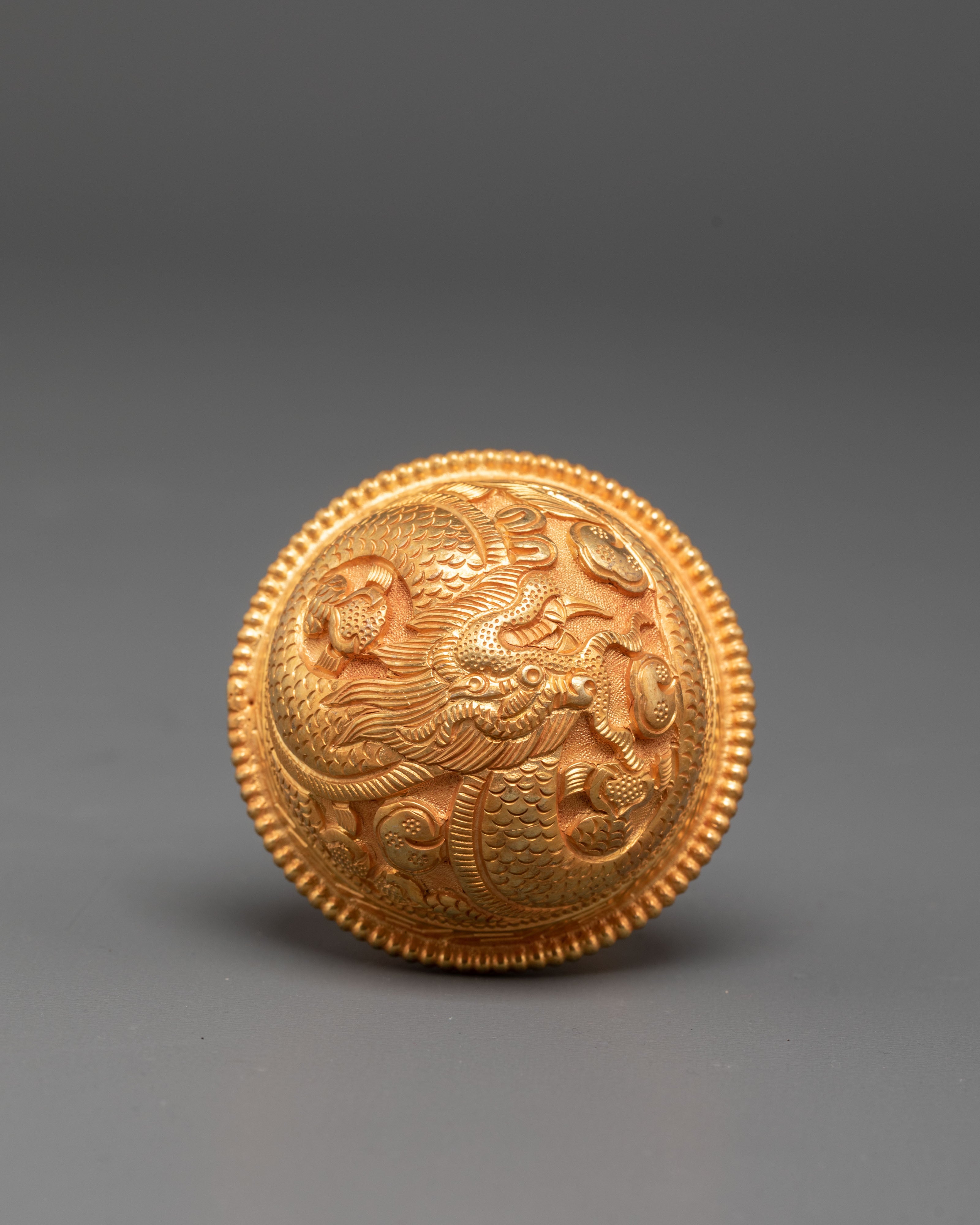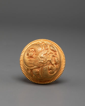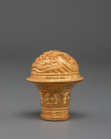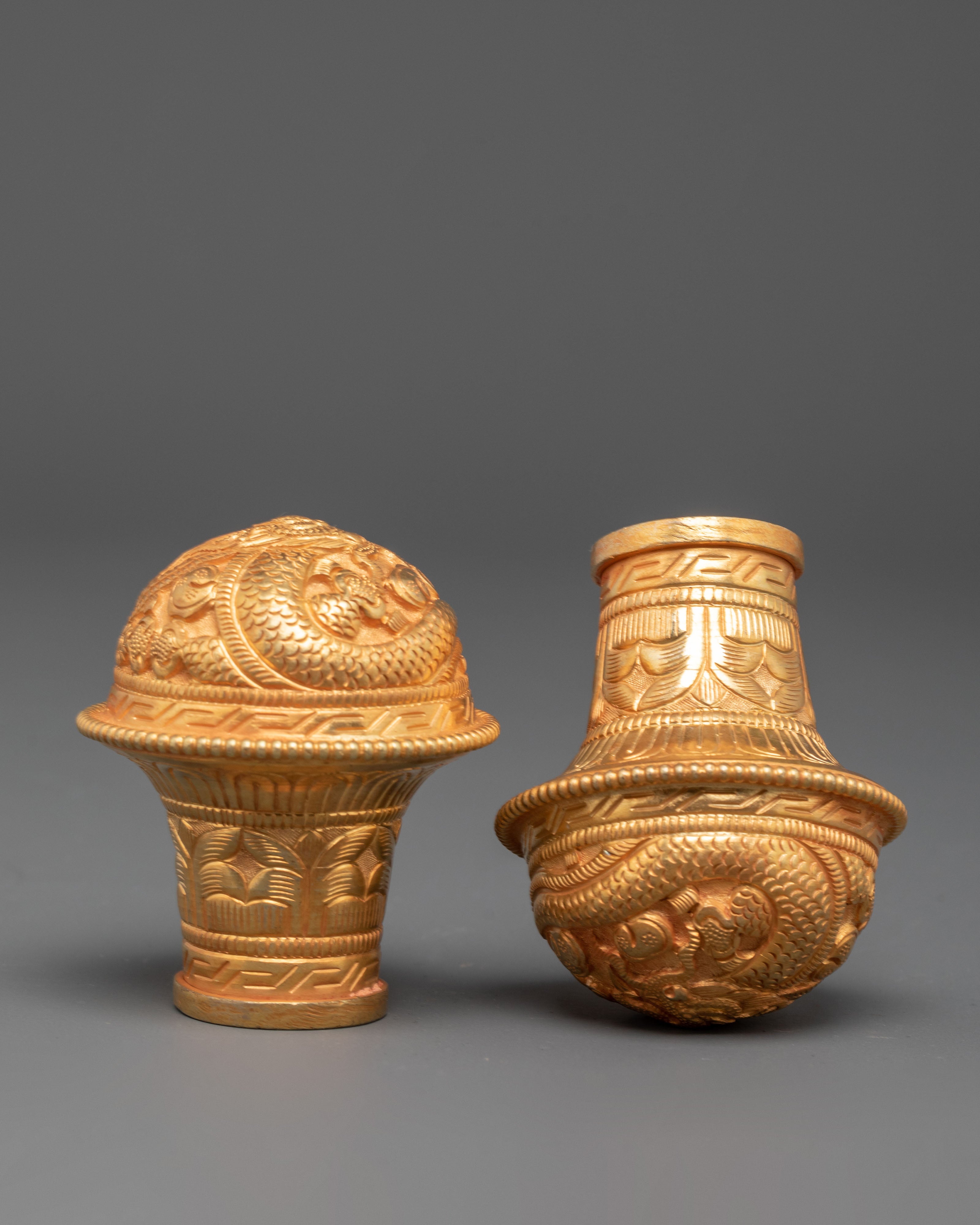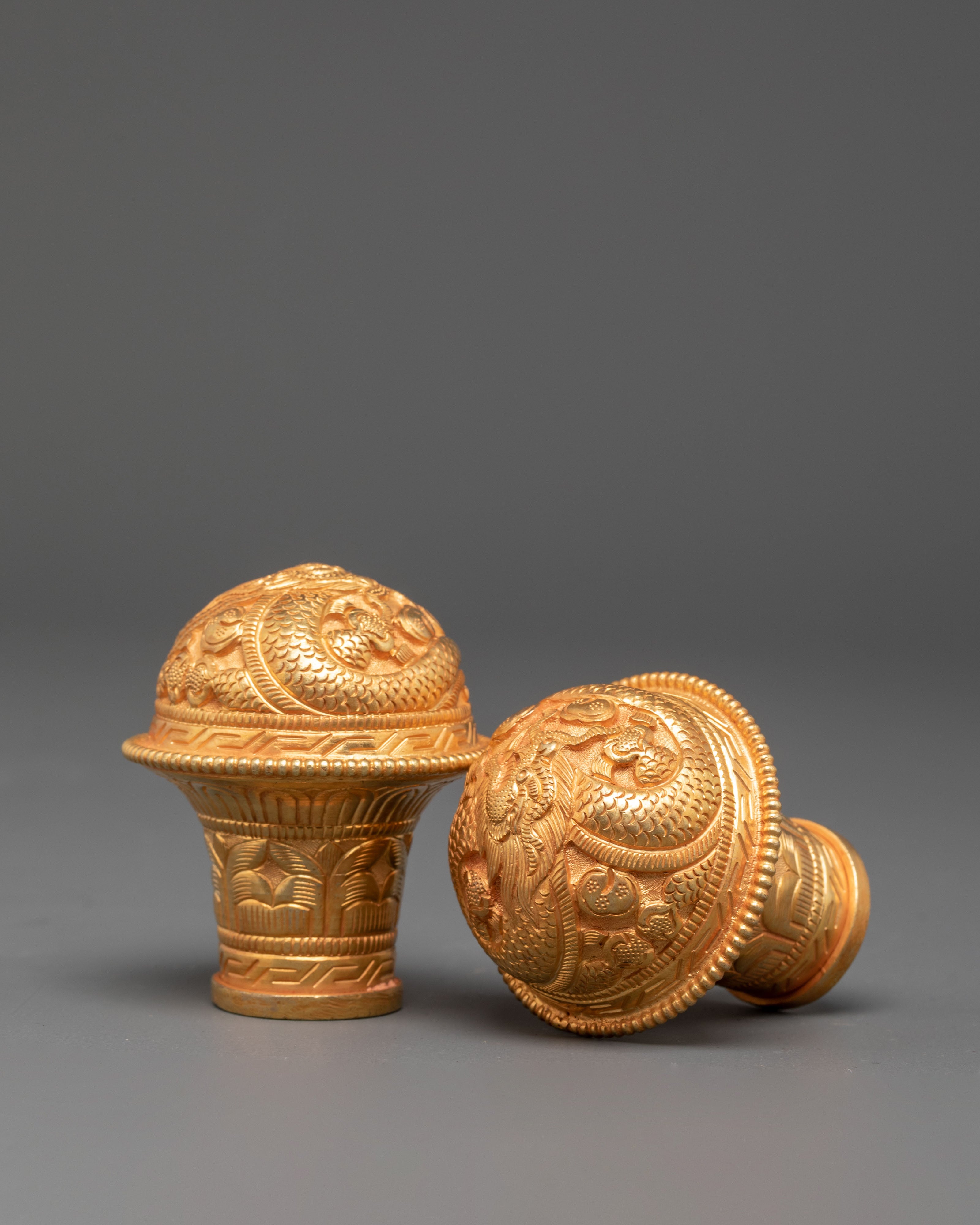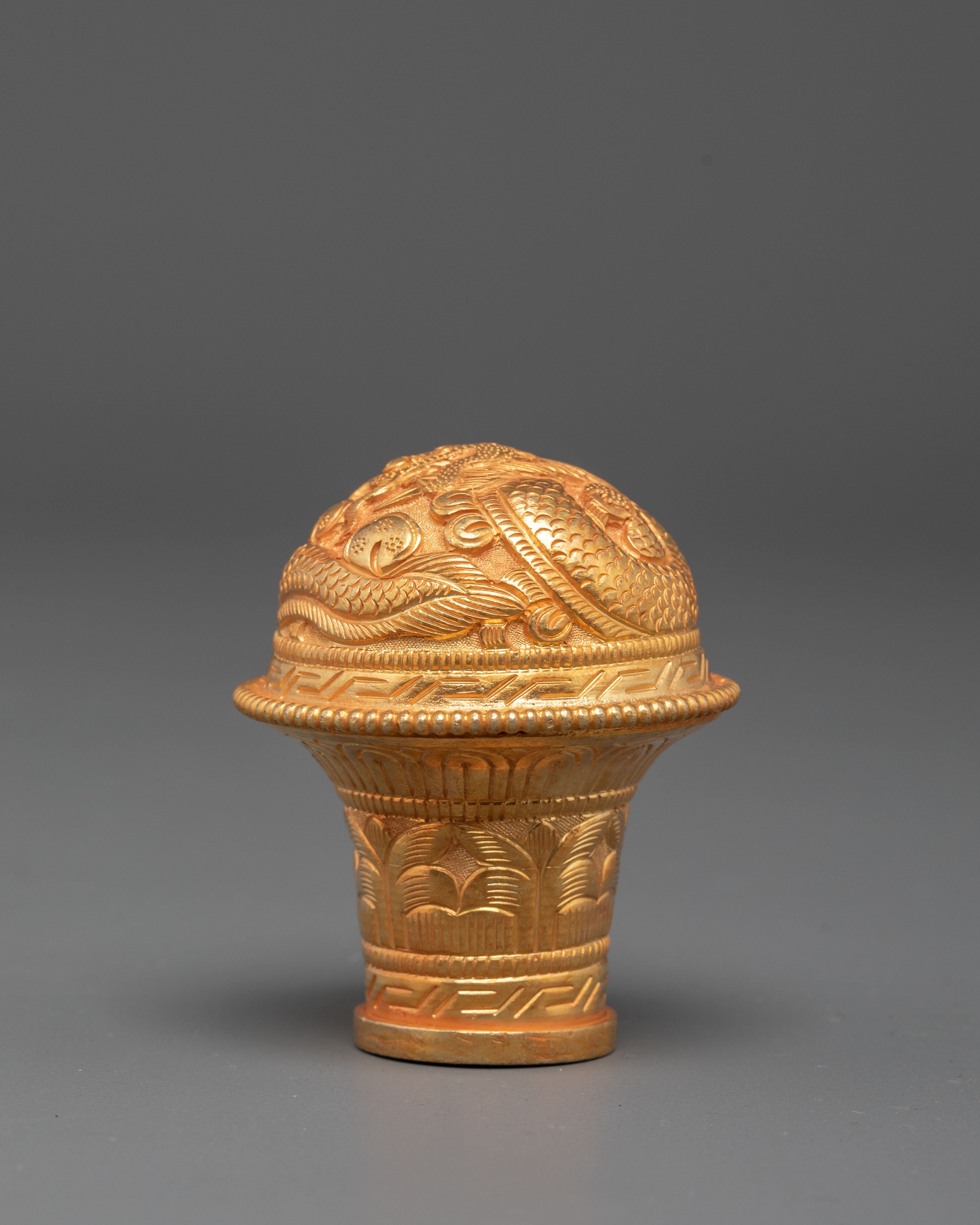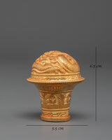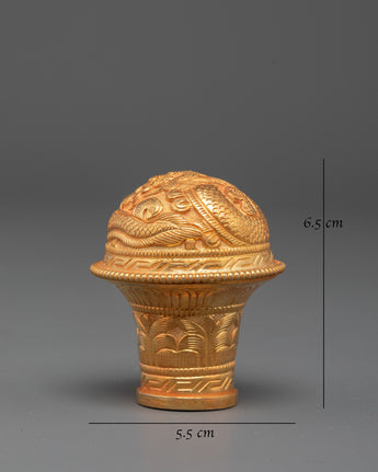 This Handmade Brocade Stick Cap is a beautifully designed Tibetan ritual decoration used in Buddhist ceremonies and sacred rituals. Each cap is made of copper with an attractive gold-plated finish and measures 6.5cm in height and 5.5cm in width, weighing a total of 0.15kg. The surface has magnificent hand-engraved dragon designs that represent strength, wisdom, and divine protection. These caps, traditionally put on offering sticks or ritual implements, serve as both protective and decorative elements, adding to the holiness and beauty of any shrine or altar.