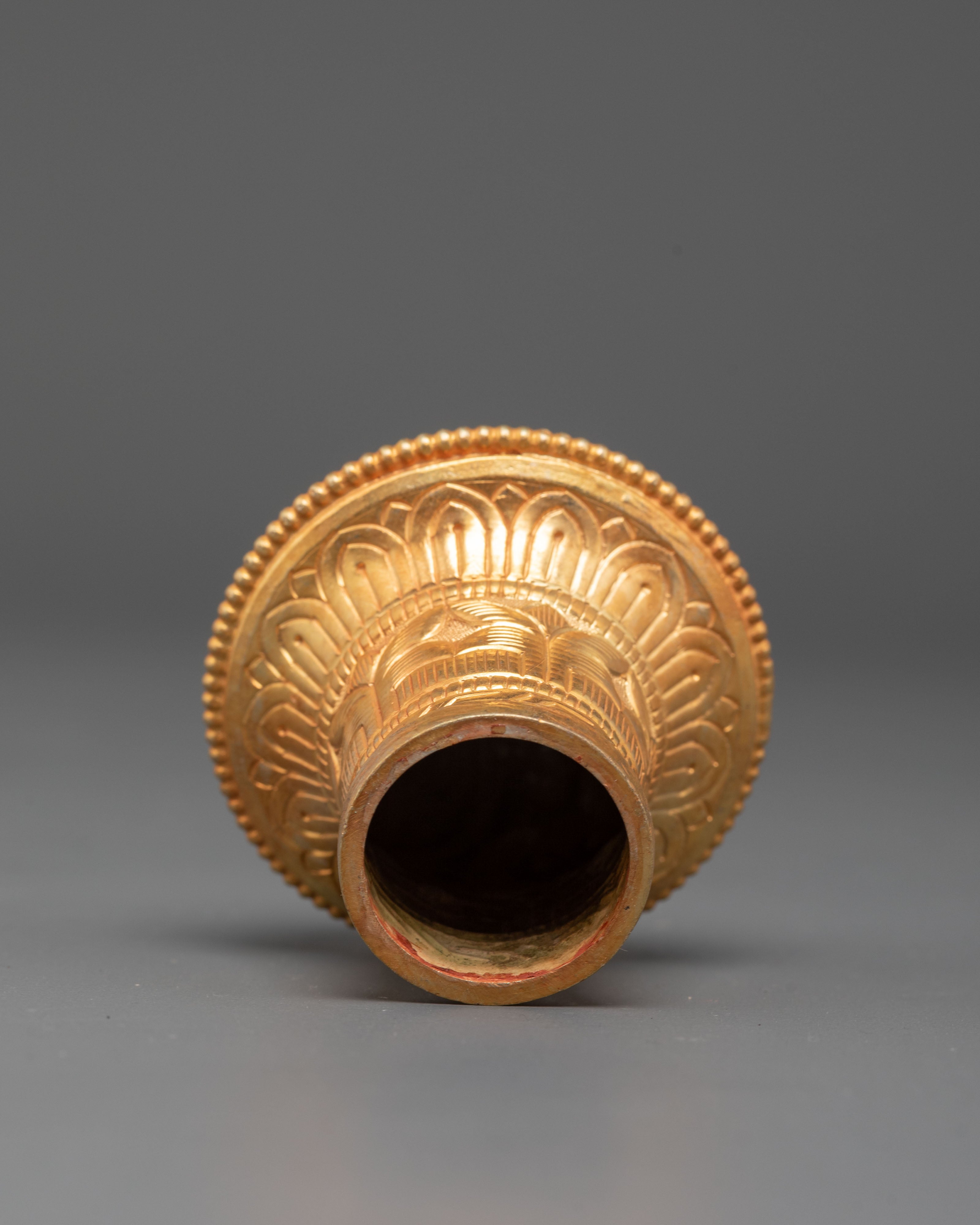 This Tibetan copper cap showcases the intricate creativity of Himalayan handicraft. The golden sheen showcases the delicate dragon scales and lotus-like base motifs, which represent the balance of power and purity. The dragon, revered in Tibetan and Himalayan iconography, symbolizes metamorphosis, fortitude, and the limitless power of enlightenment. These ritual items are suitable for practitioners who want to create a spiritually resonant space for prayer, meditation, and ceremonial offerings.