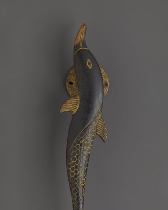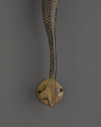 Made of brass, this piece is 31cm in width, 5.5cm in height, and weighs 0.58kg, providing an enhanced grasp. The dark-brushed finish, along with gold-engraved details, adds to its handcrafted appearance. This fish-shaped handle is ideal for sea enthusiasts, designers, and anybody who values handmade home accessories. It can be used on front doors, cabinet drawers, or to make interior design statements.