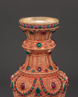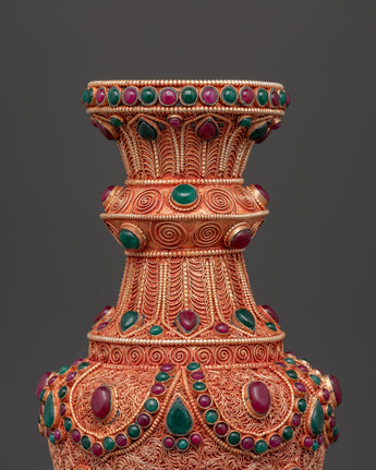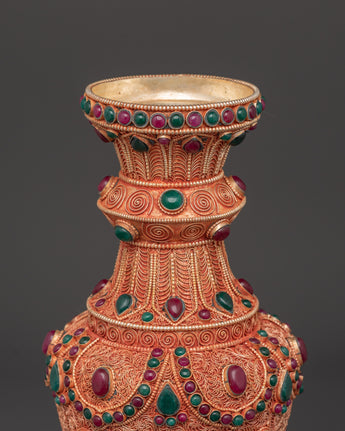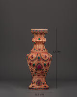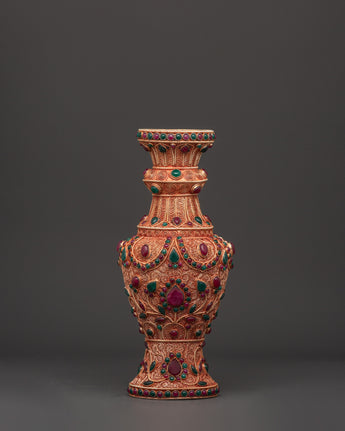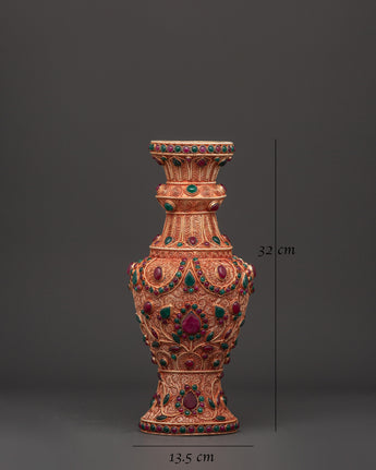 Enhance your living environment with this magnificent Handmade Flower Vase Set, which features a copper body with brilliant imitation coral and turquoise stones. Each vase is 30cm tall and 13.5cm wide, making them ideal as a gorgeous centerpiece for your home or business. The meticulous craftsmanship accentuates delicate flower themes and ethnic artistry, adding a sense of history and elegance to any space.
