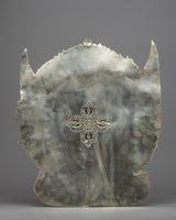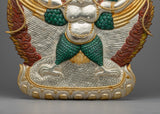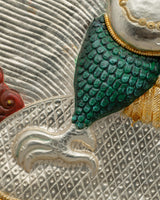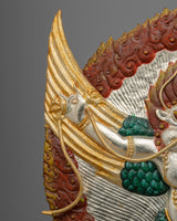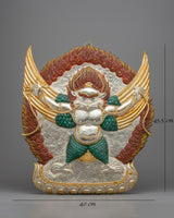 This Handmade Garuda Deity Statue is carefully made from copper, adorned with bright electro gold and silver plating, and enhanced with vibrant acrylic paintings. This exquisite piece of artwork, measuring 45.5 cm in height and 40 cm in breadth and weighing 1.40 kg, combines workmanship with spirituality. The combination of metallic finishes and colorful finishing touches results in a visually stunning item that radiates divine energy and elegance, making it an appealing addition to any decor.