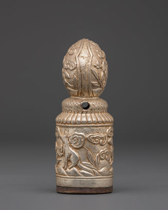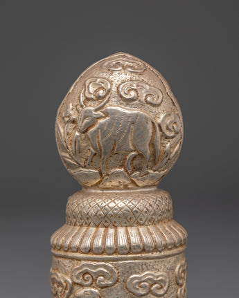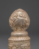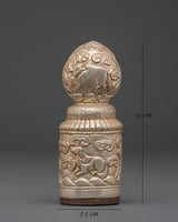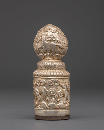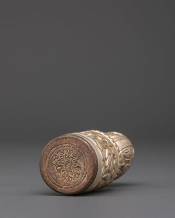This Handmade Spiritual Stamp is a precious ritual object used in Buddhist rituals to bless offerings, prayer materials, and meditation tools. The cylindrical shape is embellished with symbolic animal motifs and swirling patterns, which represent protection, prosperity, and spiritual energy. Its intricate carvings make it an appropriate complement to any altar, shrine, or meditation place, adding a sense of reverence to spiritual practice.