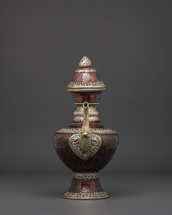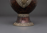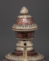 Crafted with cultural reverence and visual splendor, this handmade teapot exemplifies Tibetan ceremonial artistry. Standing 35 cm tall and weighing 1.30 kg, it is made from copper with decorative white copper accents, showcasing a traditional hammered finish. It sports an elegantly curved spout and a regal dragon-headed handle, connected by a chain to a beautifully carved lid, serving both decorative and functional purposes.