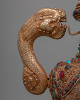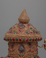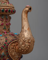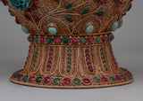 This Handmade Tibetan Tea Pot is a stunning work of art, made of copper and plated in electro gold and silver. This tea pot, measuring 40 cm in height and 22 cm in diameter and weighing 3.09 kg, is a significant work that embodies the beauty and spirituality of Tibetan handicraft. The delicate inlay of auris ruby, panna, and filigree work provides brilliant colors and profound symbolic value, since these precious stones have long been associated with healing, protection, and wisdom.