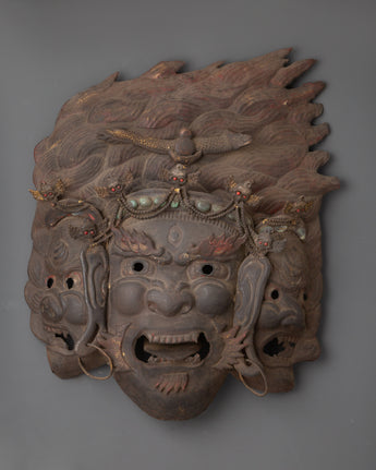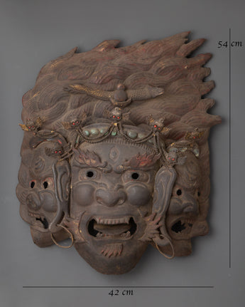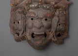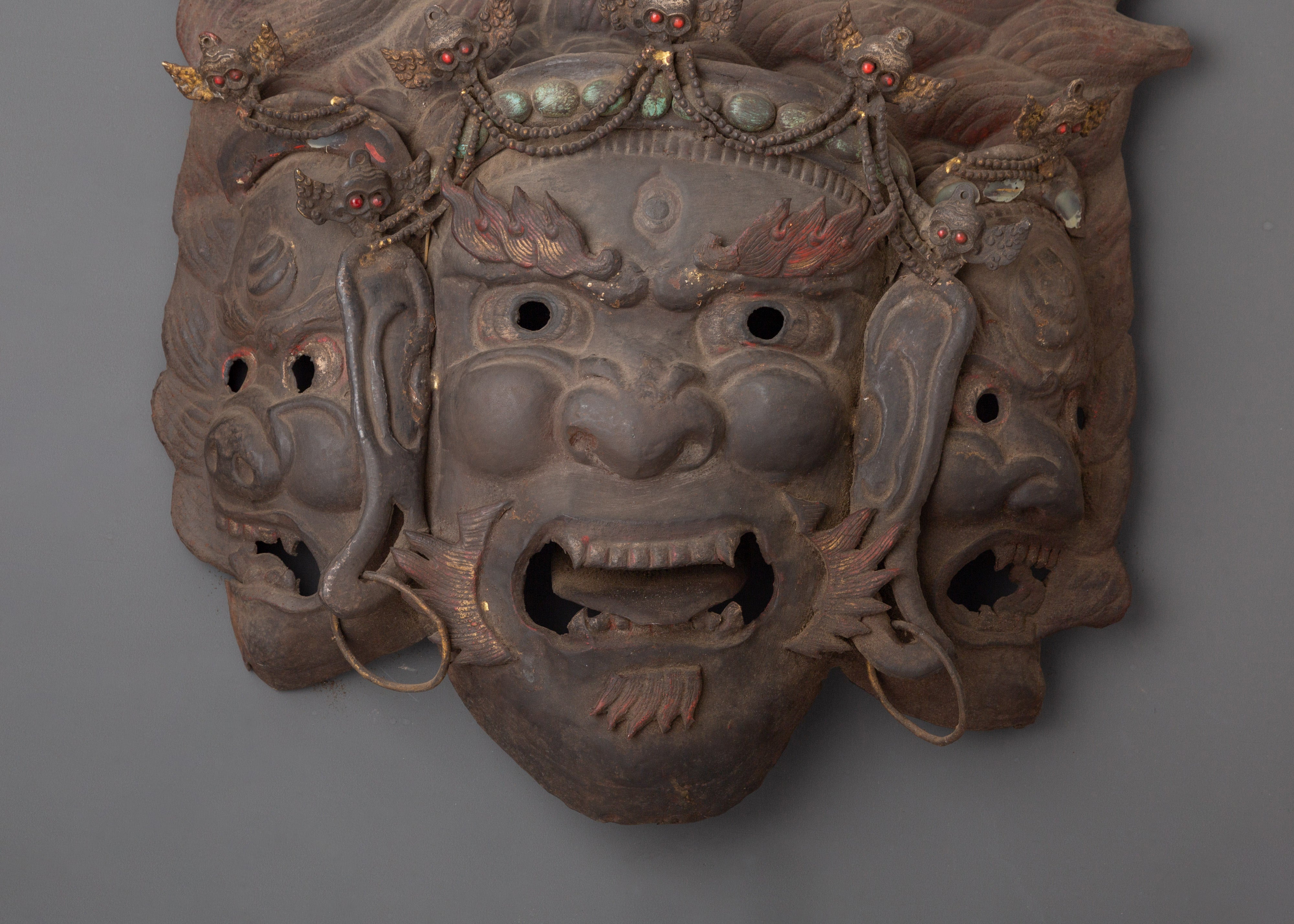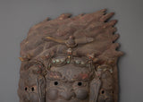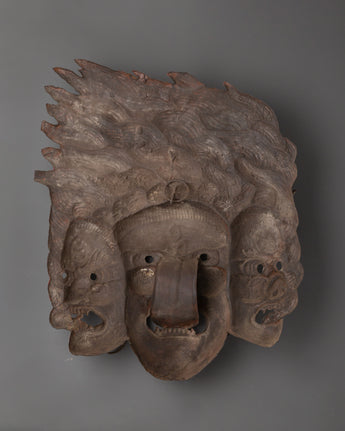 The mask features a fierce central face flanked by two guardian faces, forming a striking tri-form composition often associated with spiritual protection and ceremonial symbolism. Intricate motifs, raised detailing, and the crown-like headpiece emphasize its ritual significance and give the piece a sense of authority and cultural depth. Each sculpted feature contributes to its representation of vigilance, strength, and safeguarding energy—qualities revered in traditional ceremonial art.