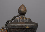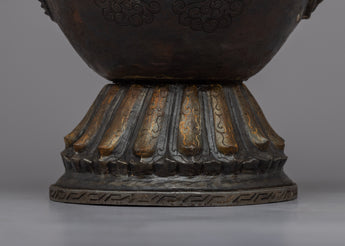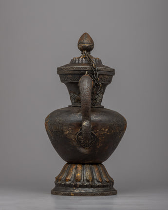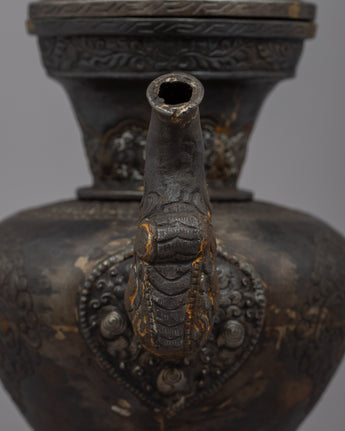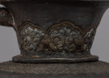 Tea in Tibet was an important staple in the diet. The tea was made from Chinese black tea bricks. Butter from yaks and salt were then added and churned together to give a thick, soup-like liquid. This was drunk throughout the day by all social classes. This teapot would have come from an aristocratic family or perhaps a wealthier monastery. There are some minor dents associated with age and use and an overall excellent patina.