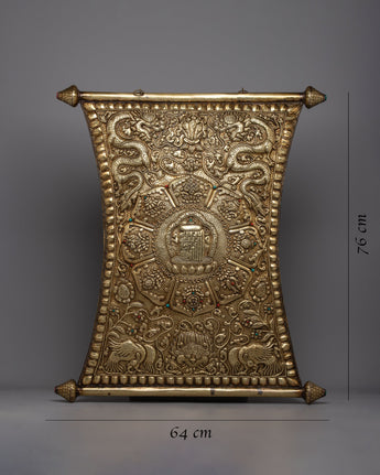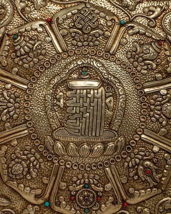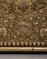 The Metal Thanka Wall Hanging is real and elegant, with every part crafted with precision and attention to detail. The Kalachakra's fine craftsmanship and the surrounding auspicious symbols highlight our craftsmen's ability, and the brass material gives the piece a timeless charm.