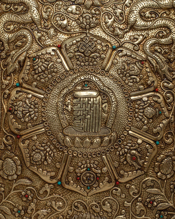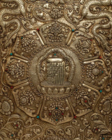 A metal thangka is a type of thangka painting that is made on a metal surface rather than on traditional canvas or paper. Metal thangkas are often made using copper, brass, or silver and are usually decorated with intricate designs and Buddhist iconography using a technique called repoussé. This involves hammering the metal from the reverse side to create a raised relief image on the front. Metal thangkas are known for their durability and are often used in ritual contexts or as decorative pieces in Buddhist homes and temples. They are particularly common in Tibet, where they have been produced for centuries.