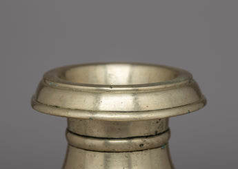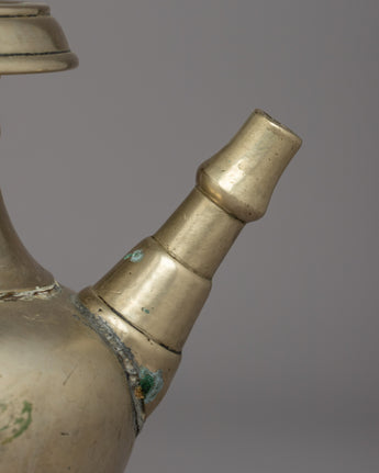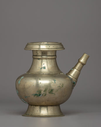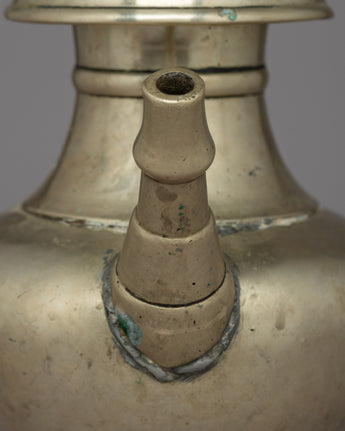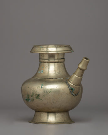The Karuwa, made of bronze alloy, is a traditional vessel with an elegant and practical design. With a height of 19 cm and a width of 20 cm, this piece stands out for its smooth, rounded base that gradually transitions into a narrow neck. The subtle patina on its surface suggests age and use, adding character to the finish. The spout's design is delicately curved, making it both functional and a work of art. Its shape and form exemplify the fine craftsmanship and functional artistry associated with Tibetan ritual objects.