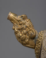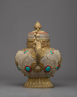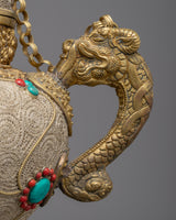 Indulge in the exquisite artistry of this Large Buddhist Tea Pot, meticulously handcrafted on a copper body and adorned with lustrous silver and opulent 24k gold plating. The tea pot's dragon handle adds an aura of mystique and power, symbolizing protection and prosperity. Its majestic presence is further enhanced by the skillful inlay of gemstones, adding a touch of elegance and luxury to this divine masterpiece. Immerse yourself in the ancient ritual of tea, as you pour steaming goodness from this resplendent pot, invoking a sense of tranquility and serenity within your sacred space. Embrace the harmonious blend of traditional craftsmanship and spiritual significance that this teapot exudes, and let it elevate your tea ceremonies to a celestial experience.