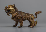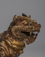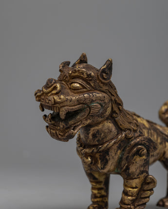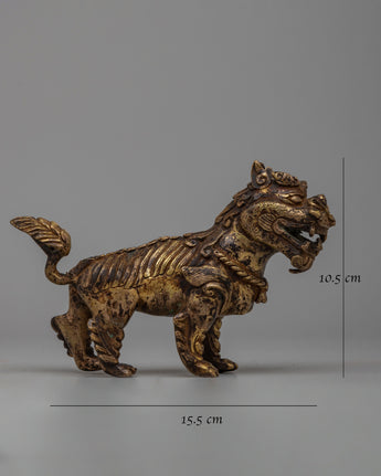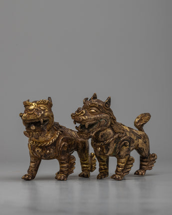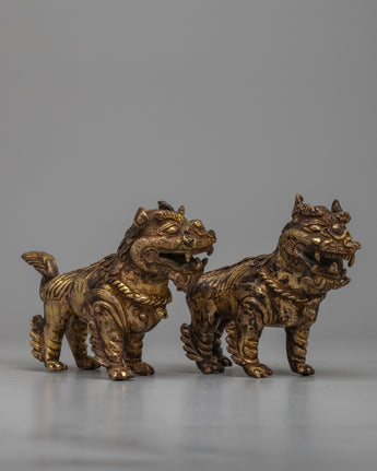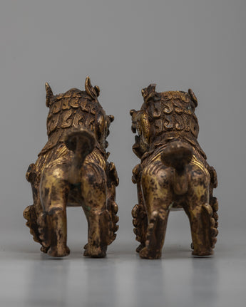 The rusted copper bodies of the meticulously crafted lion sculptures provide an air of antiquity and authenticity to their appearance. Their imposing presence is amplified and elevated to the status of symbols of grandeur and power by the brilliant 24k gold plating.