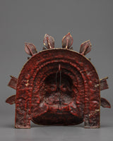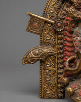 The Buddhist Mahakala Mask Wall Hanging represents the fierce protector deity Mahakala of Tibetan Buddhism. It is expertly handcrafted from brass and embellished with 24k gold plating. Mahakala's formidable essence is captured in this wall hanging with its divine gold sheen, which draws attention to his powerful visage and minute details, signifying spiritual strength and protection.
