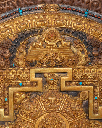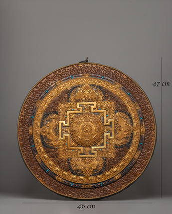 Crafted from fine oxidized copper with gold-plated ornaments, this 2.386-kilogram mandala exudes divinity and eternal beauty. The oxidized finish has an archaic, mystical allure, while the gold-plated accents represent wisdom, purity, and enlightenment. Whether displayed in temples, meditation rooms, or sacred altars, this mandala creates a peaceful spiritual atmosphere in any setting.