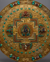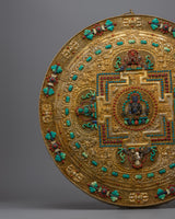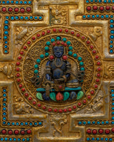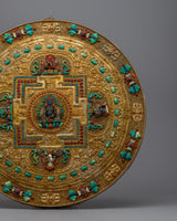 Introducing our exquisite Mandala Wall Hanging Metal Thangka, an exceptional piece with an electro-gold-plated copper body. This Thangka, weighing 1.6 kg and measuring 39.5 cm in height by 38 cm in width, is a powerful expression of artistic genius and spiritual enlightenment. At its center, a meticulously crafted Buddha is surrounded by other deities, creating a harmonious and sacred representation. The intricate design features original lapis lazuli and turquoise, which infuse the piece with genuine spiritual significance. Artificial coral is also incorporated to enhance its visual appeal, creating a captivating color combination.