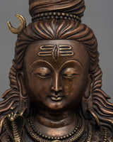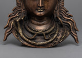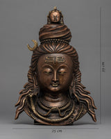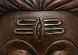 This Mask Of Shiva Deity k is a beautiful representation of the Hindu deity, Lord Shiva. Made of brass, it showcases the intricate details and workmanship of the artisan. The mask features Shiva's serene face with a third eye on his forehead, symbolizing his all-knowing nature. The headdress is adorned with crescent moons, denoting his association with time. The snake around his neck is a nod to the Hindu myth, where Lord Shiva wore a serpent as a symbol of power and protection. The intricate design and brass add a regal touch to the mask.