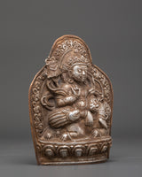 This Namtoshe plaque, which is 22 cm tall by 18.5 cm broad and weighs 0.54 kg, is excellent for hanging in meditation rooms, personal altars, or sacred areas. It has raised relief work with wonderfully curving motifs around the god, including the parasol and mongoose spouting jewels, which represent prosperity and divine supervision. The back includes a hanging loop for convenient display of this inspirational artwork.