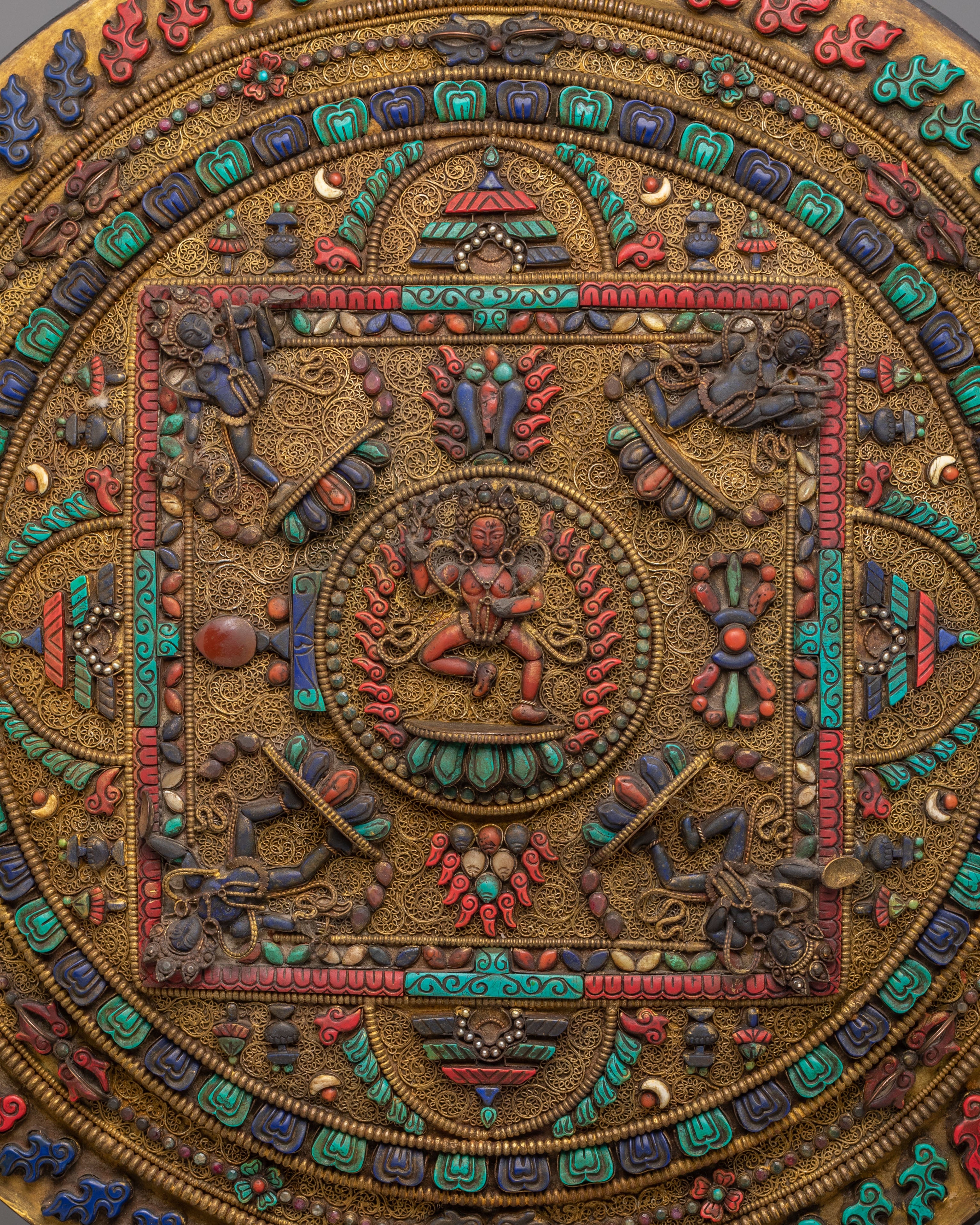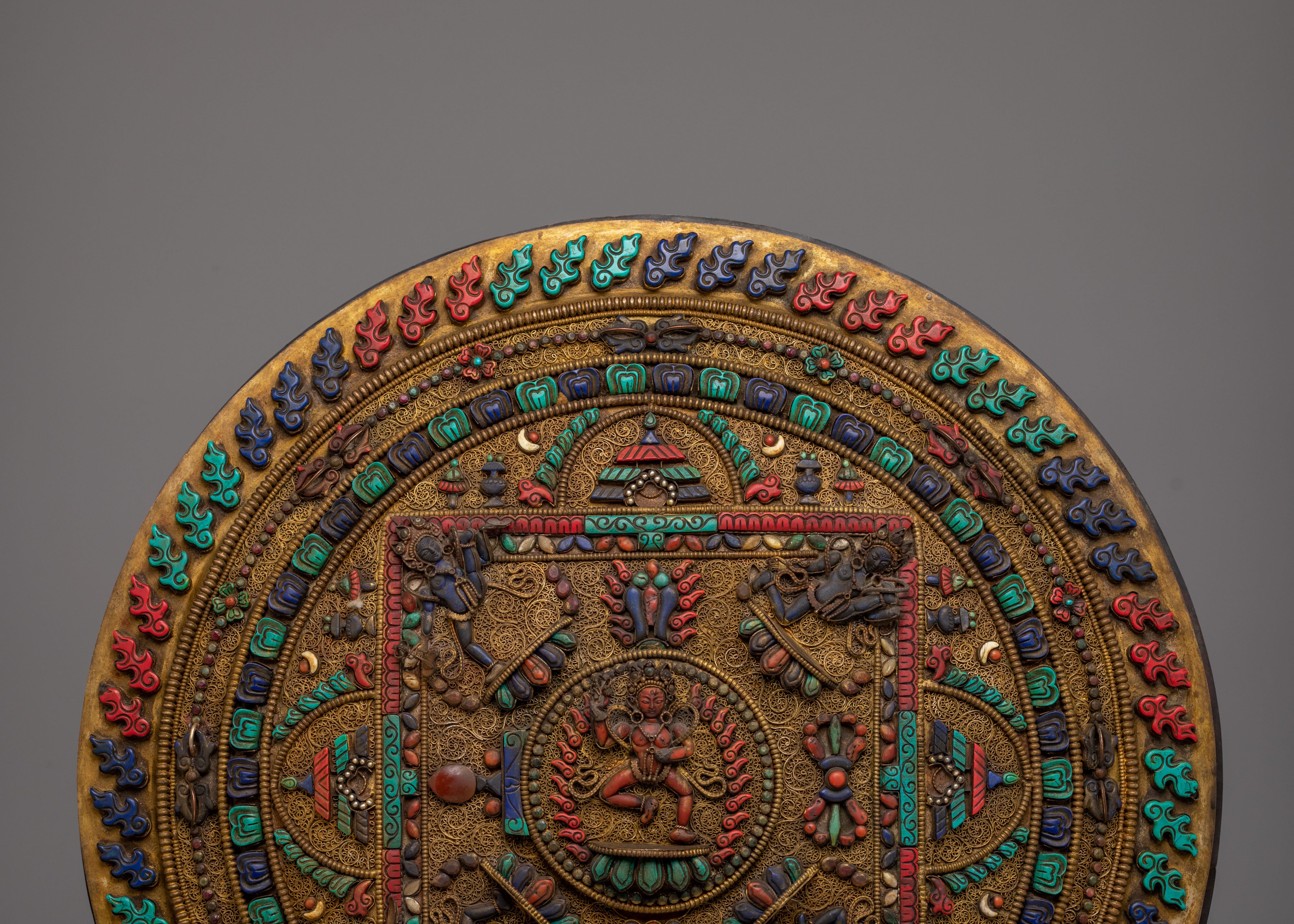 The image depicts a Nepalese Mandala, intricately crafted with symbolism and spiritual meaning. The central figure represents a deity or enlightened being, surrounded by intricate geometric patterns that symbolize the interconnectedness of the universe. The outer rings, adorned with vibrant colors, possibly represent various elements, energies, or deities, with each color carrying specific significance—red for strength, green for harmony, and blue for wisdom. The square in the center of the Mandala represents balance, the four cardinal directions, or the foundation of spiritual practice. The use of handcarved gemstones and meticulous detailing illustrates the importance of craftsmanship and devotion, making this Mandala not only a work of art but also a tool for meditation, symbolizing the journey toward enlightenment and cosmic unity.