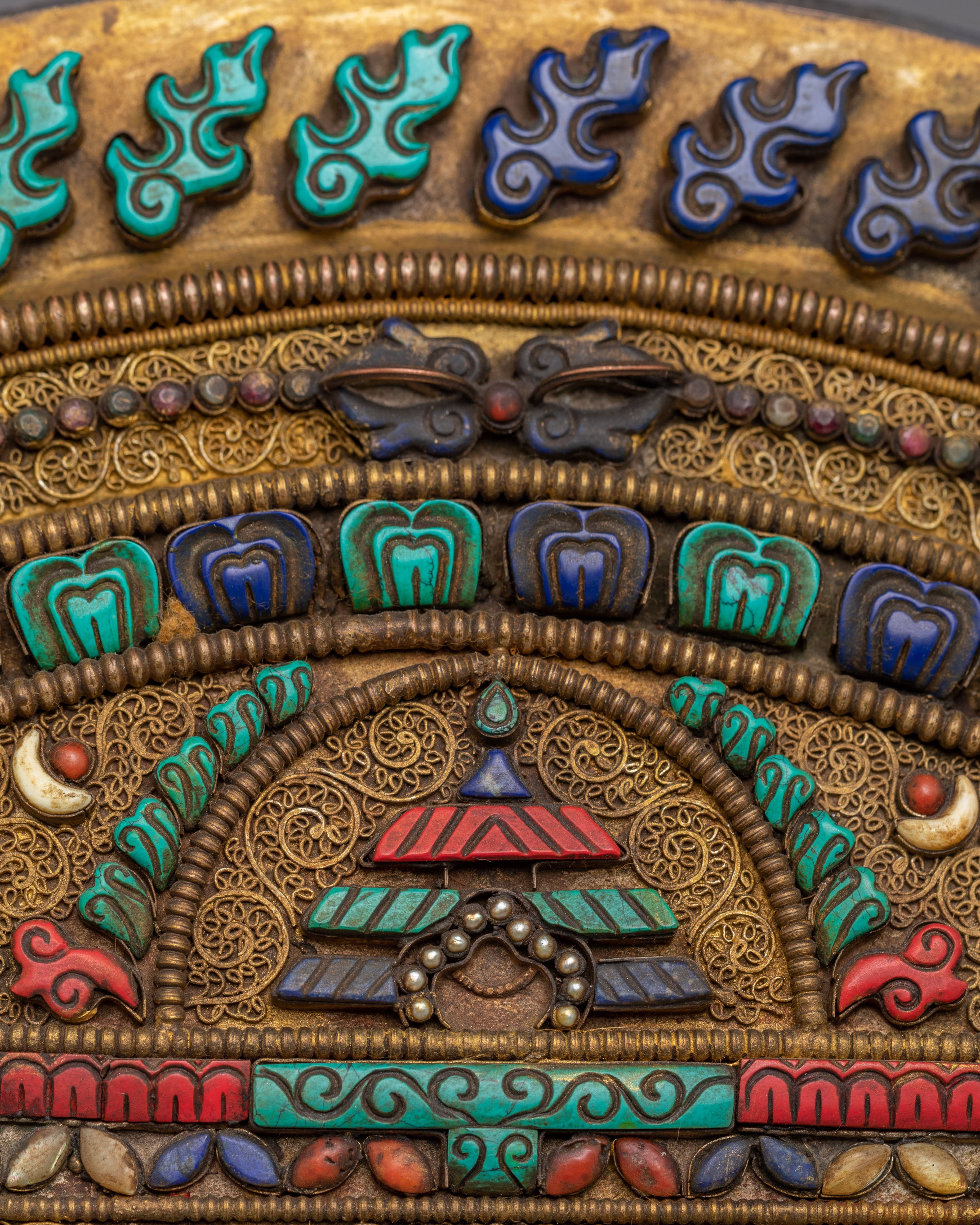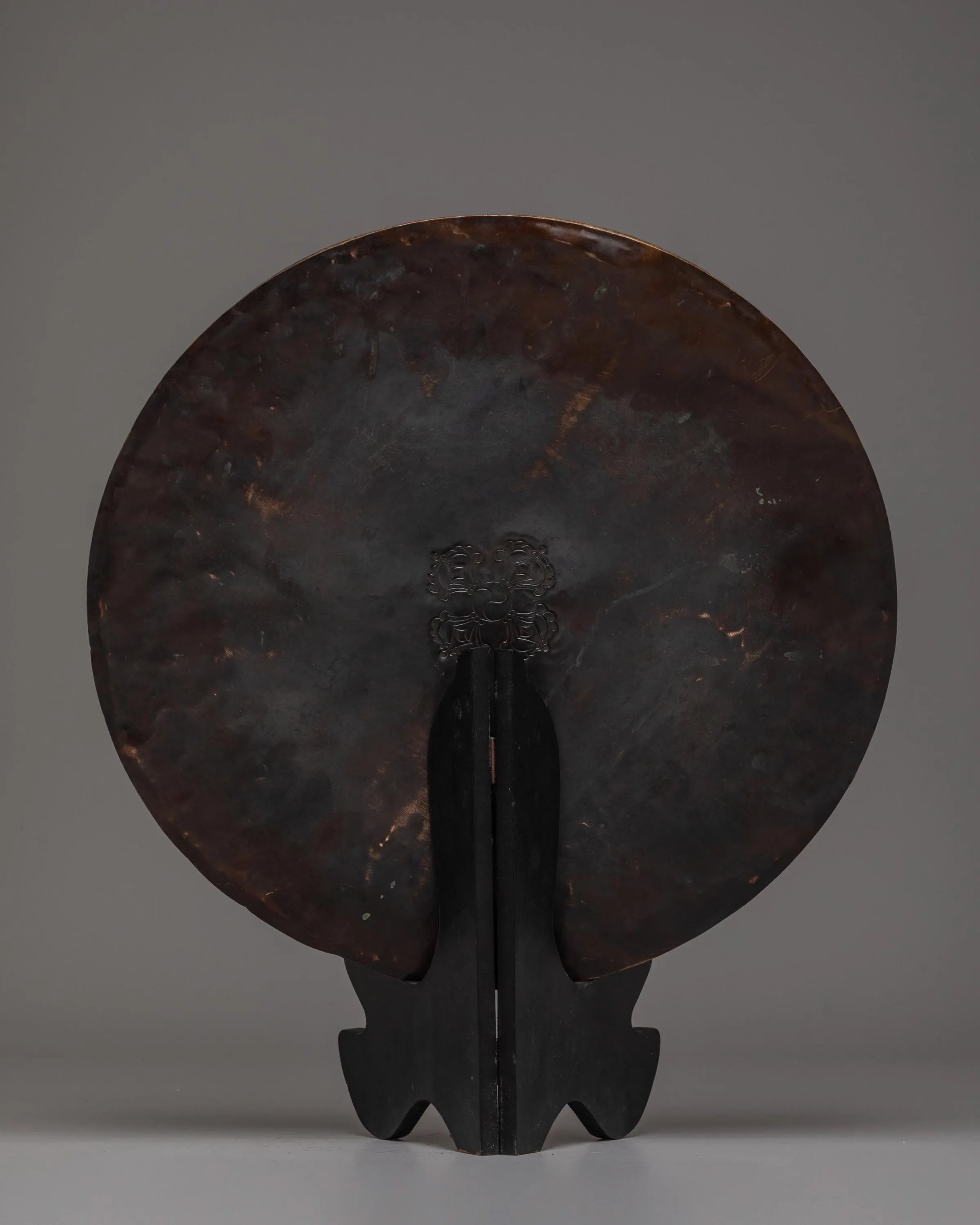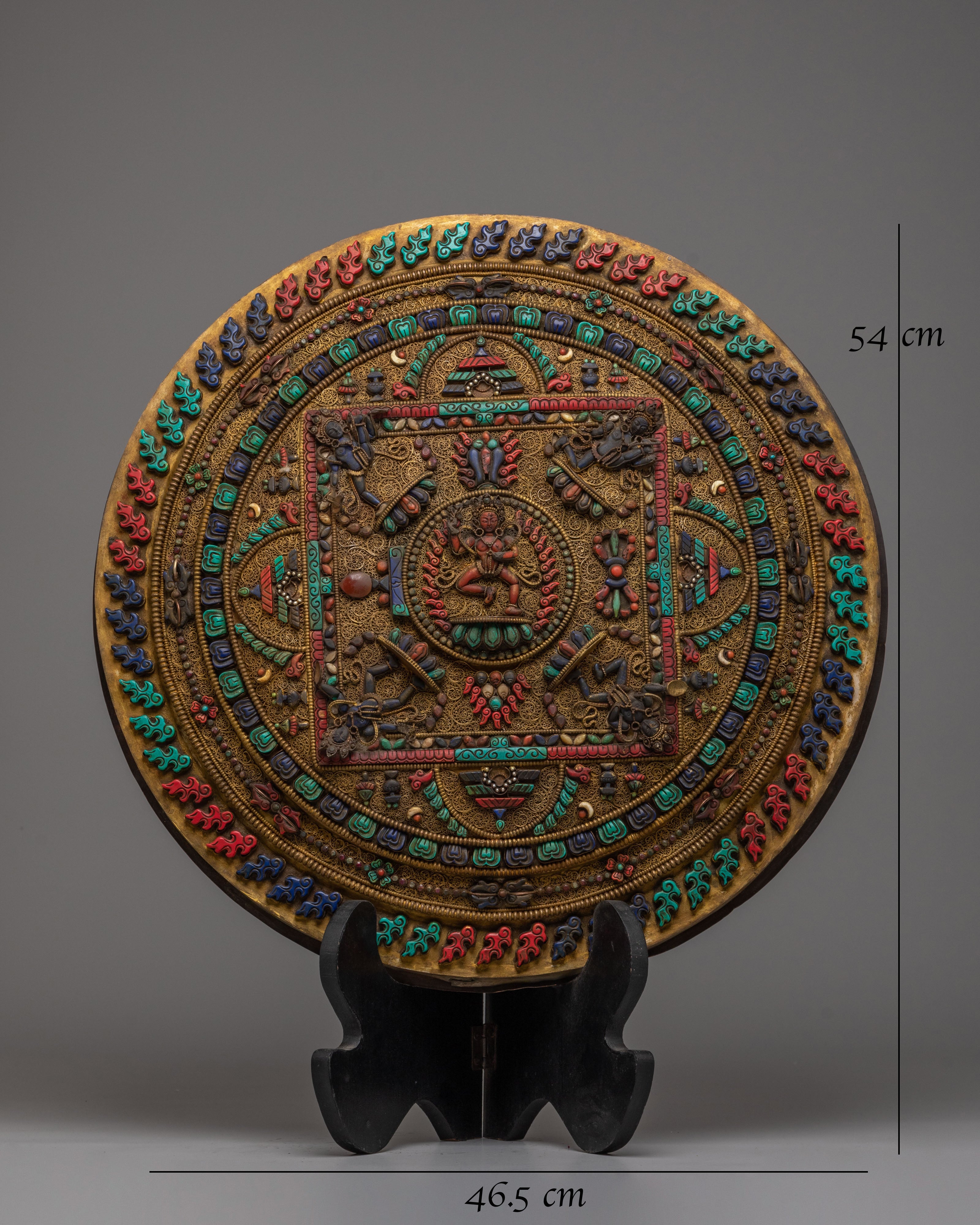The Traditional Nepalese Mandala with Stand is a stunning piece of spiritual decor, crafted with attention to detail. Standing at 54 cm tall and 46.5 cm wide, this mandala is made from high-quality copper, wood, and handcarved gemstones, bringing an aura of serenity and sacred energy into your home. Inspired by the sacred Jogini Mandala, it represents harmony, balance, and spiritual connection. The intricate design features detailed geometric patterns that invite meditation and reflection, making it an ideal addition to any altar, meditation space, or living area. This Mandala with its stand serves as both a decorative piece and a reminder of the interconnectedness of all things.