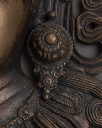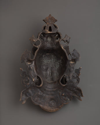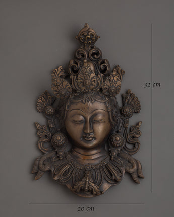Oxidized Brass Green Tara Wall Hanging is made of oxidized brass. This beautifully crafted artwork, 32 cm tall and 20 cm wide, is a striking portrayal of Green Tara, the renowned Tibetan Buddhist goddess famed for her speedy protection and limitless compassion. Green Tara, a symbol of enlightened activity and mercy, is frequently invoked for guidance, healing, and removing barriers. This Buddhist decor item is excellent for establishing a sacred space in your home altar, meditation room, or spiritual corner.