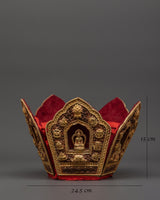 The oxidized copper Tibetan crown is artistically carved with the five Dhyani Buddhas, each representing a different facet of the enlightened mind. Vairochana (middle), Akshobhya, Ratnasambhava, Amitabha, and Amoghasiddhi. This crown is more than just a pretty piece; it is a spiritual artifact from the Tibetan Vajrayana tradition frequently utilized in ceremonial ceremonies, tantric rituals, and monastery dance. The elaborate workmanship on the crown displays superb craftsmanship and commitment, with symbols representing inner transformation and the five elements. It is constructed of oxidized copper and finished with electro gold plating, exuding antiquity and spiritual grandeur. Whether displayed on a home altar, worn in sacred performance, or treasured as a spiritual heirloom, this crown represents the profound essence of Tibetan Buddhist art, meditation ritual equipment, and handcrafted sacred décor.