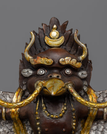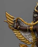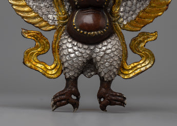 This exquisitely created Precious Garuda Wall Hanging, which represents protection and spiritual guardianship, is a traditional Tibetan Buddhist wall hanging of the sacred garuda. The Garuda, a formidable bird-like god in Tibetan Buddhism, is crafted from copper body and plated in both electro gold and electro silver. It is seen as a shield against evil energies. The exquisite workmanship and minutely detailed design that characterize Tibetan spiritual art are on display in this wall hanging.