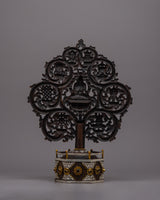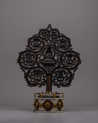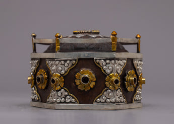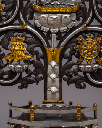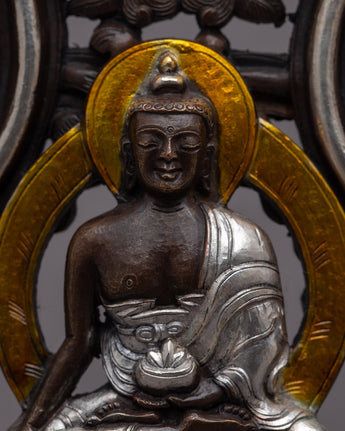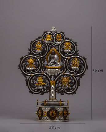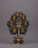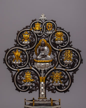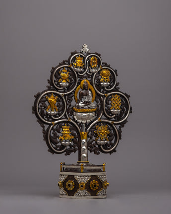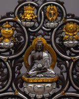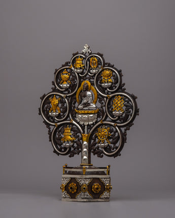 Discover the spiritual importance and ancient elegance of our handcrafted Ratnasambhava Buddha with eight auspicious symbols. This magnificent statue combines classic artistry with modern elegance. It is painstakingly crafted on a copper body and finely decorated with electro gold and silver plating. Ratnasambhava is depicted with tranquil grace, surrounded by the 8 auspicious symbols that stand for auspiciousness and benefits in Tibetan Buddhism. Ratnasambhava is a sign of boundless richness and spiritual wealth.