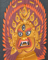 Bhairava is a fierce form of the Hindu god Shiva. This relief artwork in the wooden ply of Bhairava Head is a beautiful and intricate representation of the deity. The head is crafted from clay and is mounted on a wooden base. The artwork is framed with a fiber border. The piece is a stunning example of art and would make a great addition to any home or collection.