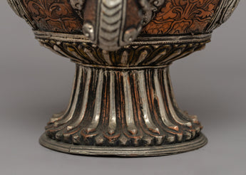 This Tibetan teapot is both a functional and decorative piece. Its intricate silver-plated surface contrasts beautifully with the natural copper, making it a valuable addition to any traditional Tibetan or spiritual artifact collection. Whether used for practical tea ceremonies or as a stunning centerpiece, this teapot combines tradition, beauty, and utility. It is an excellent combination of spiritual and artistic elements, ideal for those looking to incorporate a piece of Tibetan heritage into their home or rituals.
