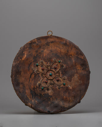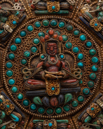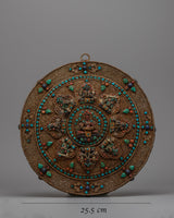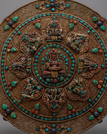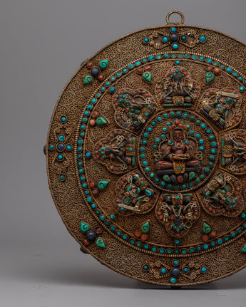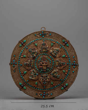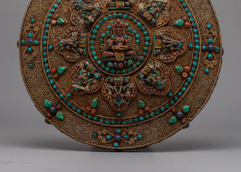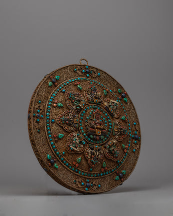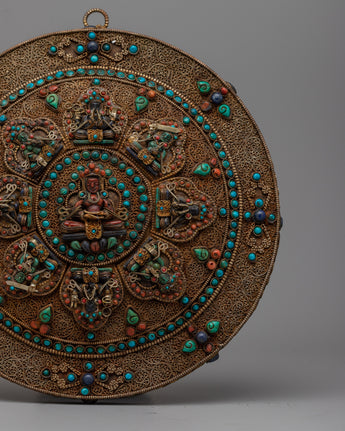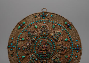Semi-precious stones, such as lapis lazuli, turquoise, and coral, are expertly inlaid into this wall hanging to enhance its overall appeal. The spiritual significance of these stones—turquoise for protection, coral for vitality, and lapis lazuli for insight and inner truth—goes beyond their aesthetic appeal. These components form a potent sign of blessings, enlightenment, and spiritual protection.