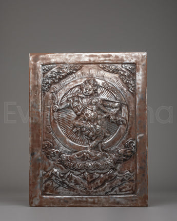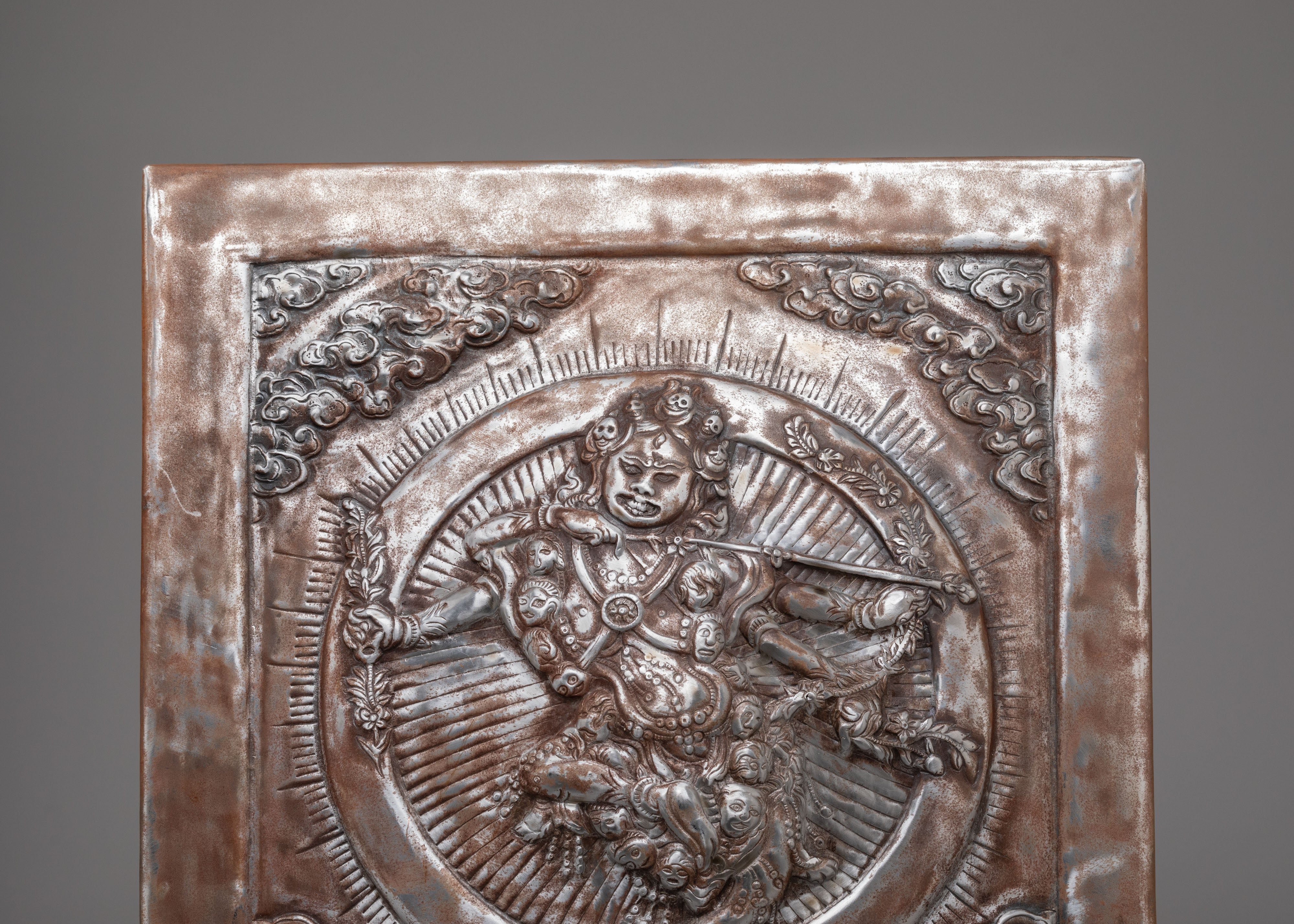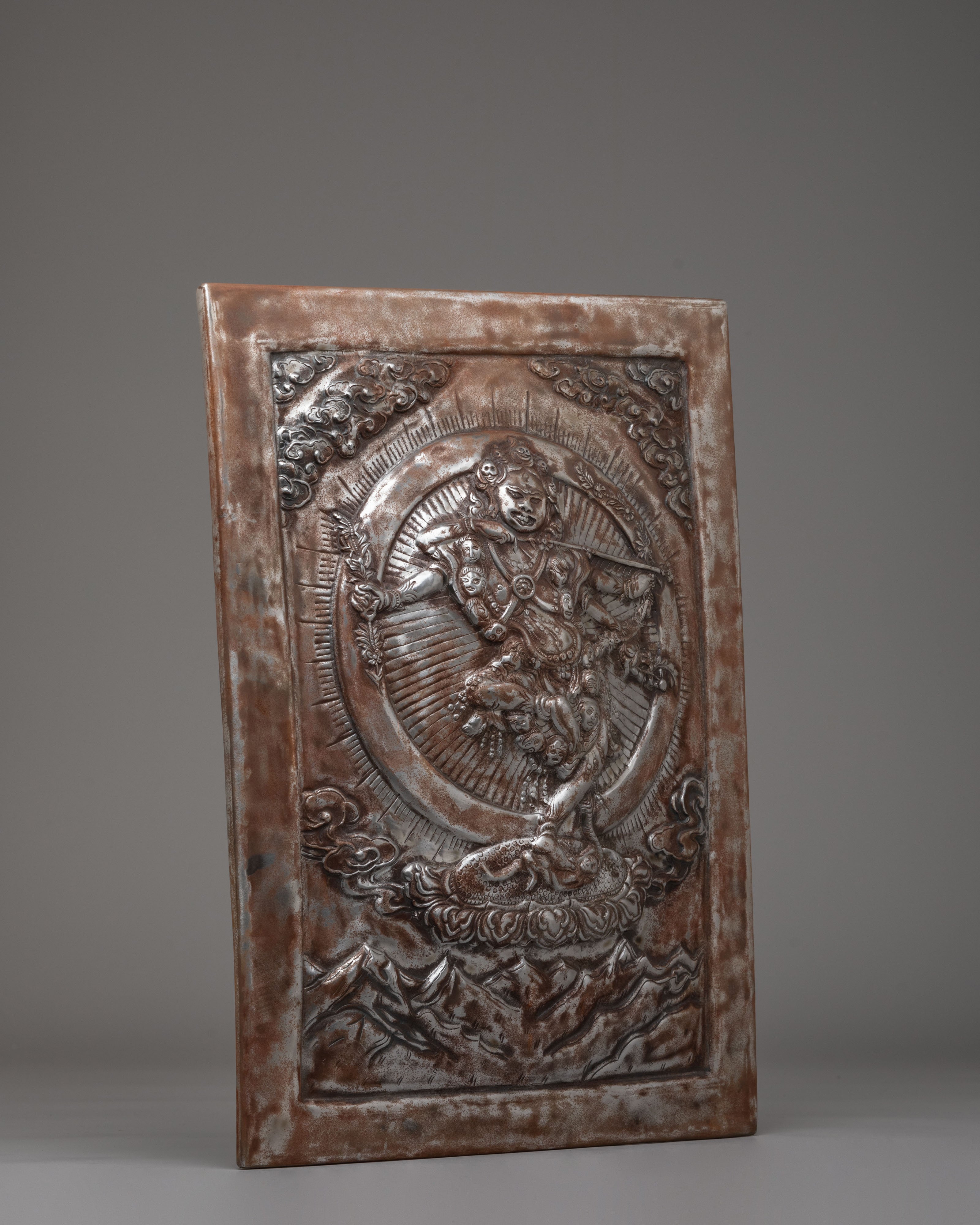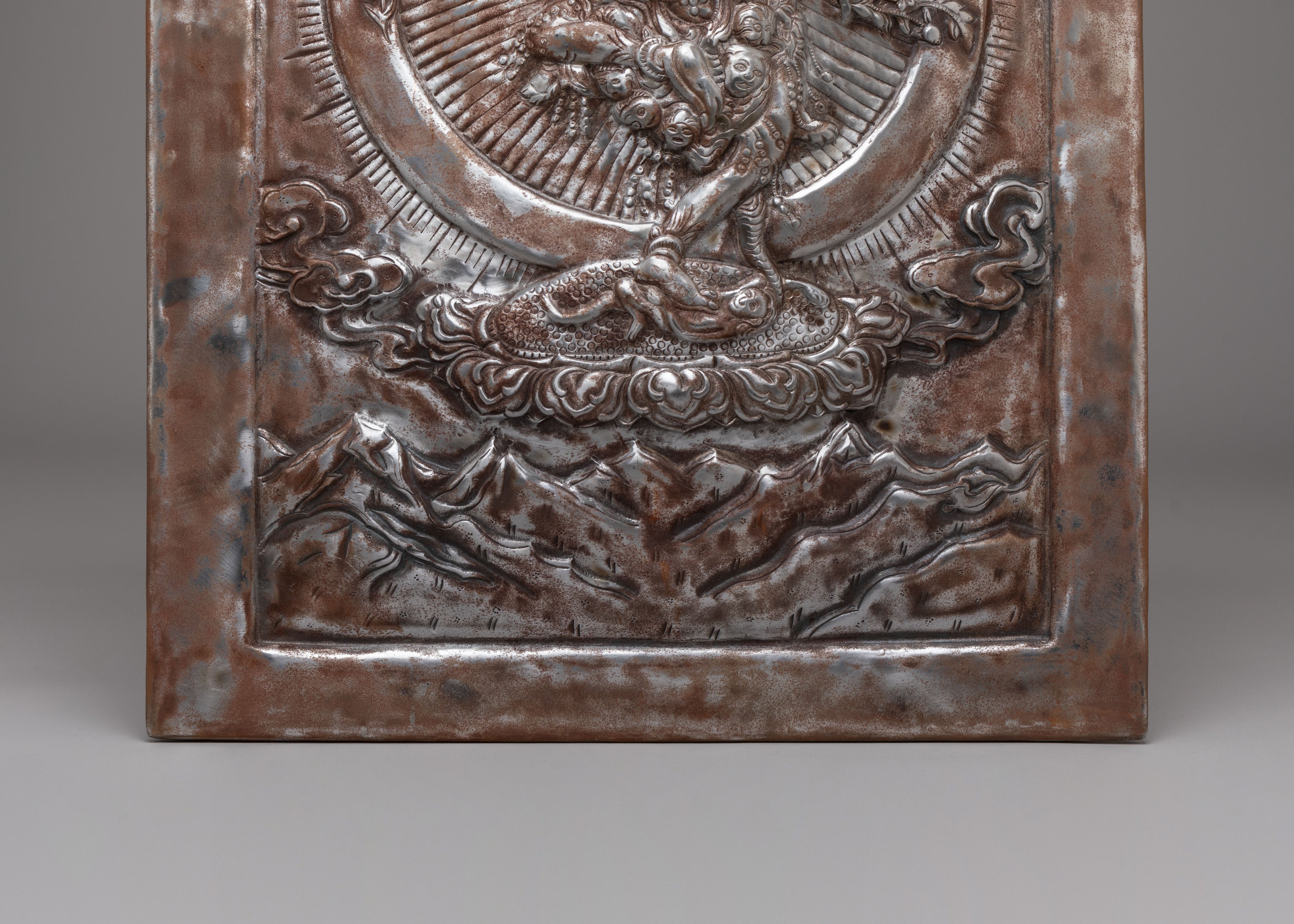 The design of this Vajrayogini relief is rich in symbolism, with the goddess shown in a dance of spiritual power, surrounded by celestial elements that represent her influence over the world. The relief captures her multi-armed form, each hand symbolizing a different aspect of her divine attributes. The mountainous landscape and cloud motifs at the base further reinforce her connection to the earth and the heavens, illustrating her ability to transcend worldly limitations. The use of iron enhances the strength and durability of the piece while providing a timeless aesthetic that captures the essence of Tibetan Buddhist art.
