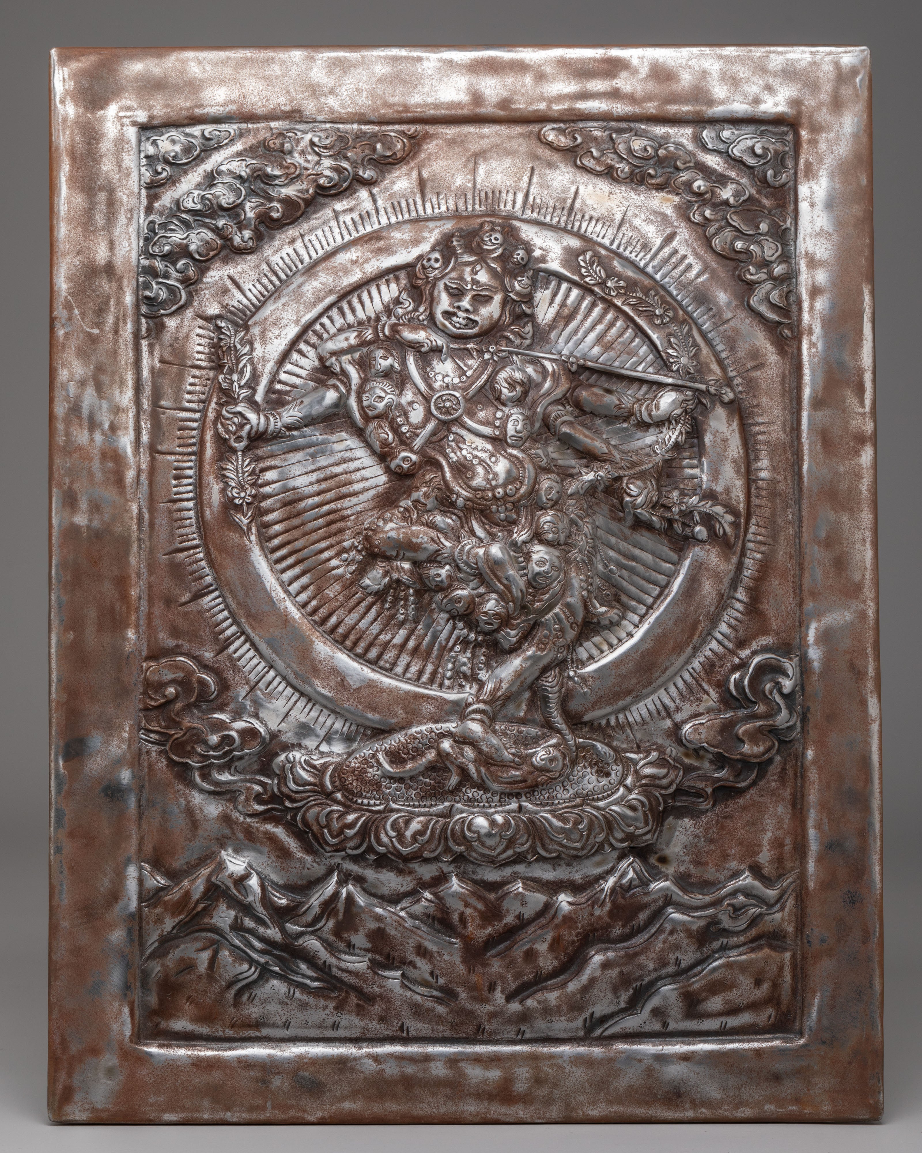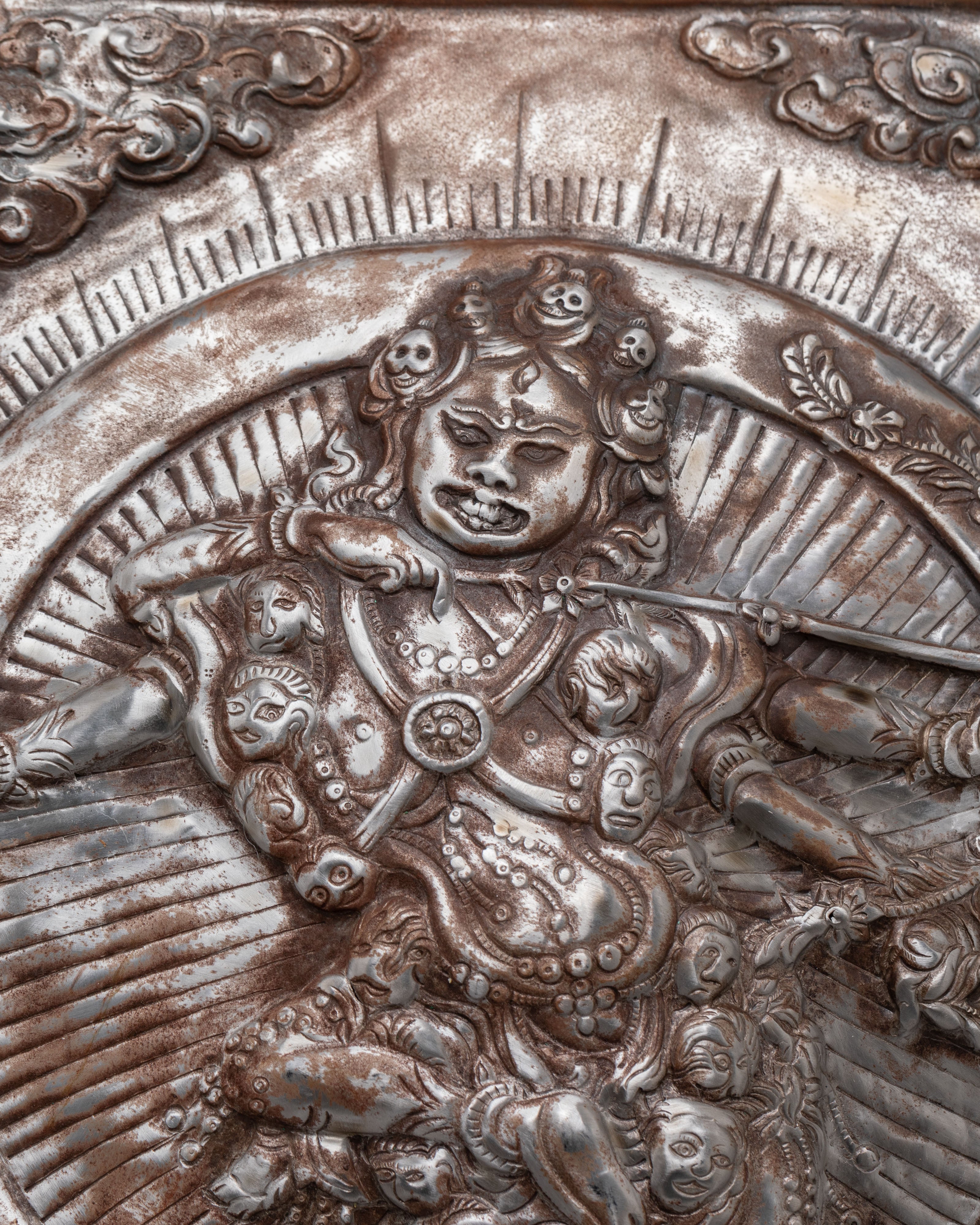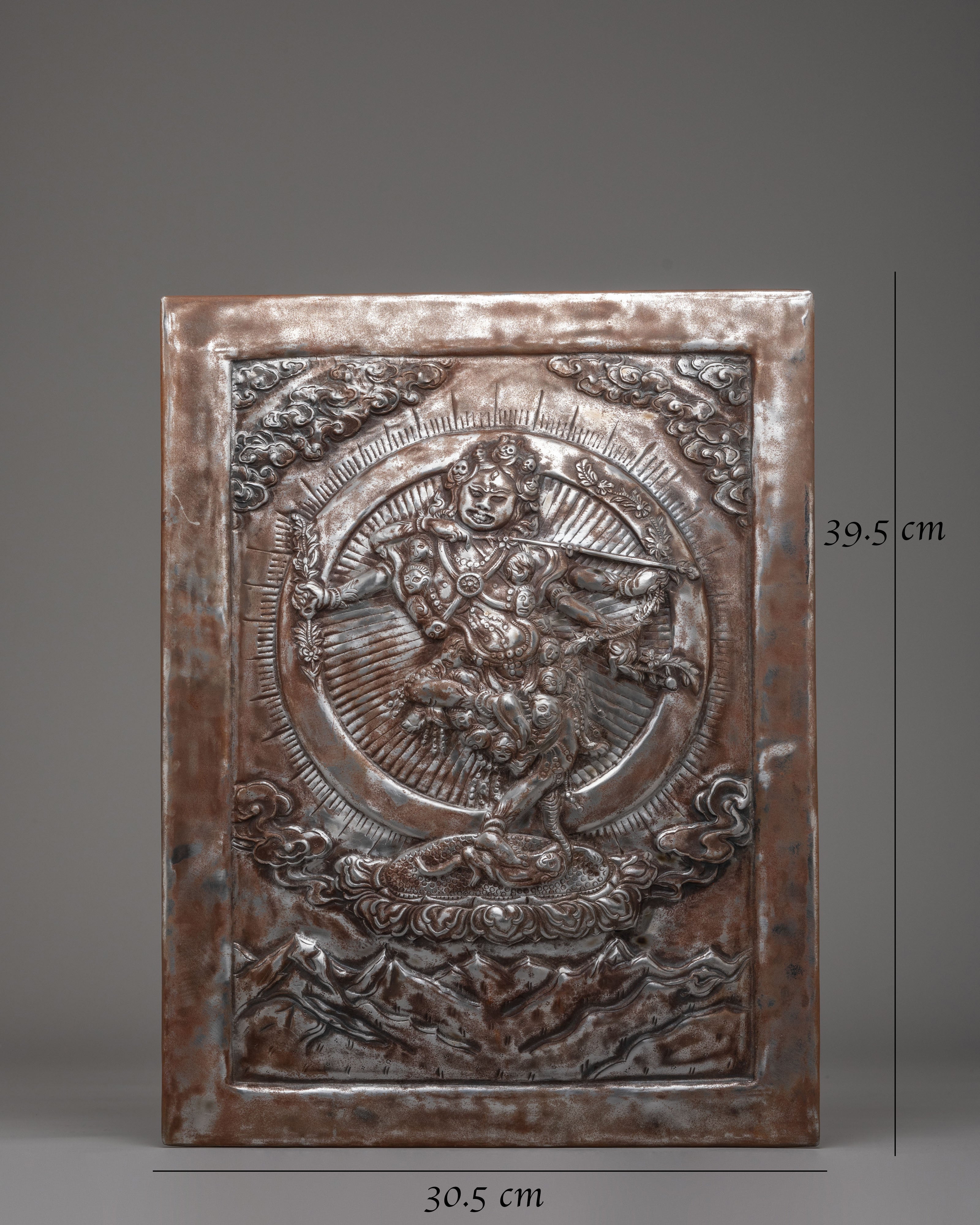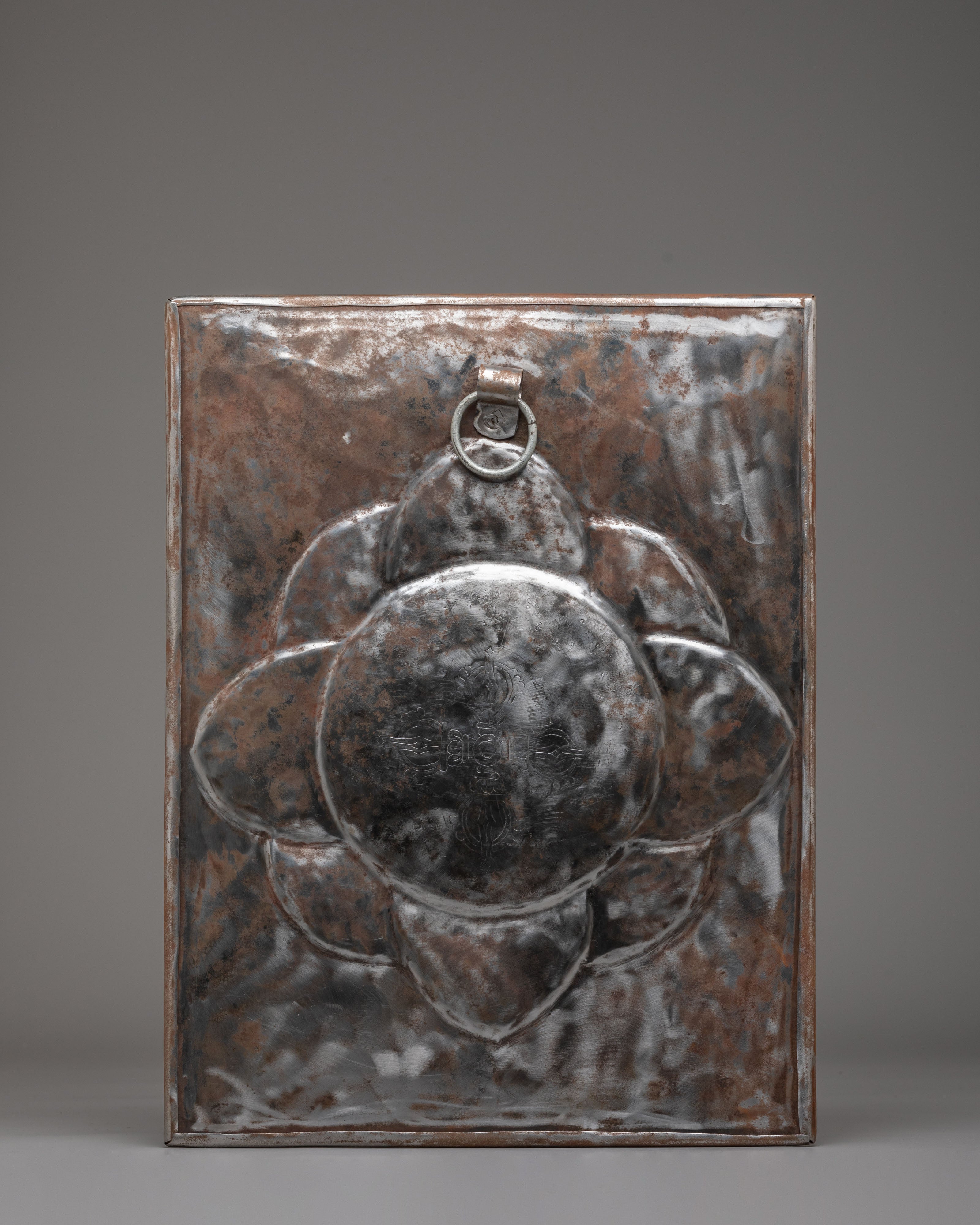The design of this Vajrayogini relief is rich in symbolism, with the goddess shown in a dance of spiritual power, surrounded by celestial elements that represent her influence over the world. The relief captures her multi-armed form, each hand symbolizing a different aspect of her divine attributes. The mountainous landscape and cloud motifs at the base further reinforce her connection to the earth and the heavens, illustrating her ability to transcend worldly limitations. The use of iron enhances the strength and durability of the piece while providing a timeless aesthetic that captures the essence of Tibetan Buddhist art.
