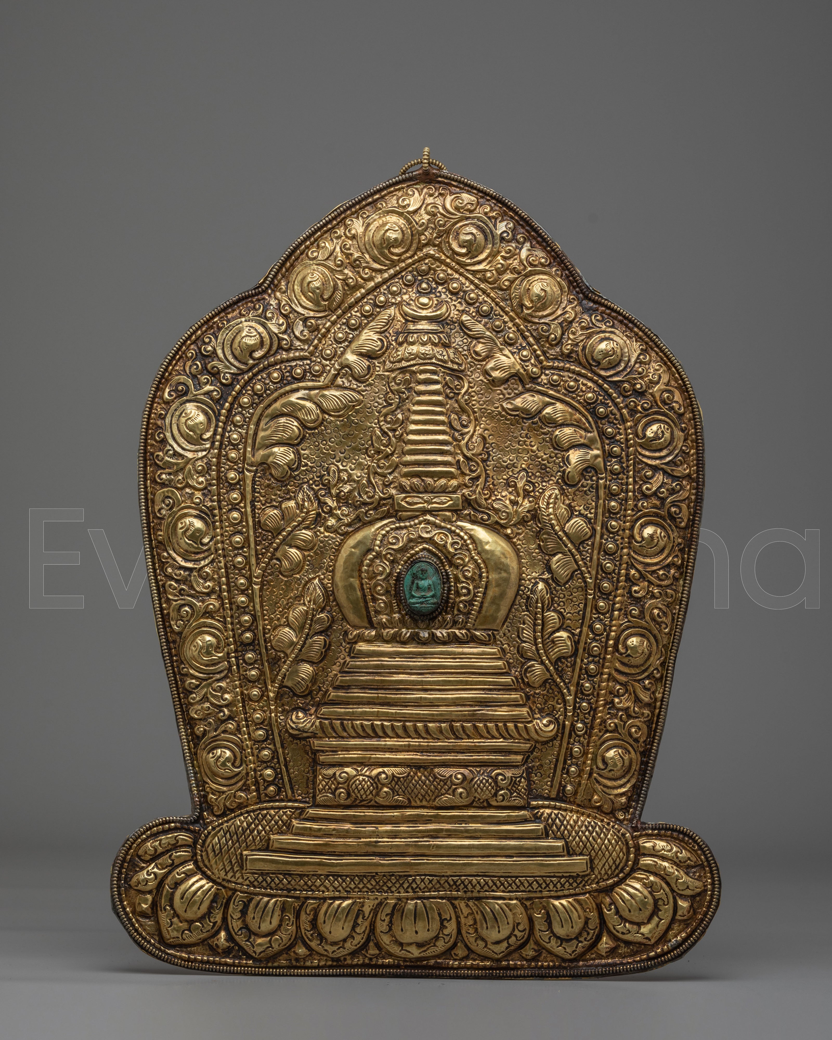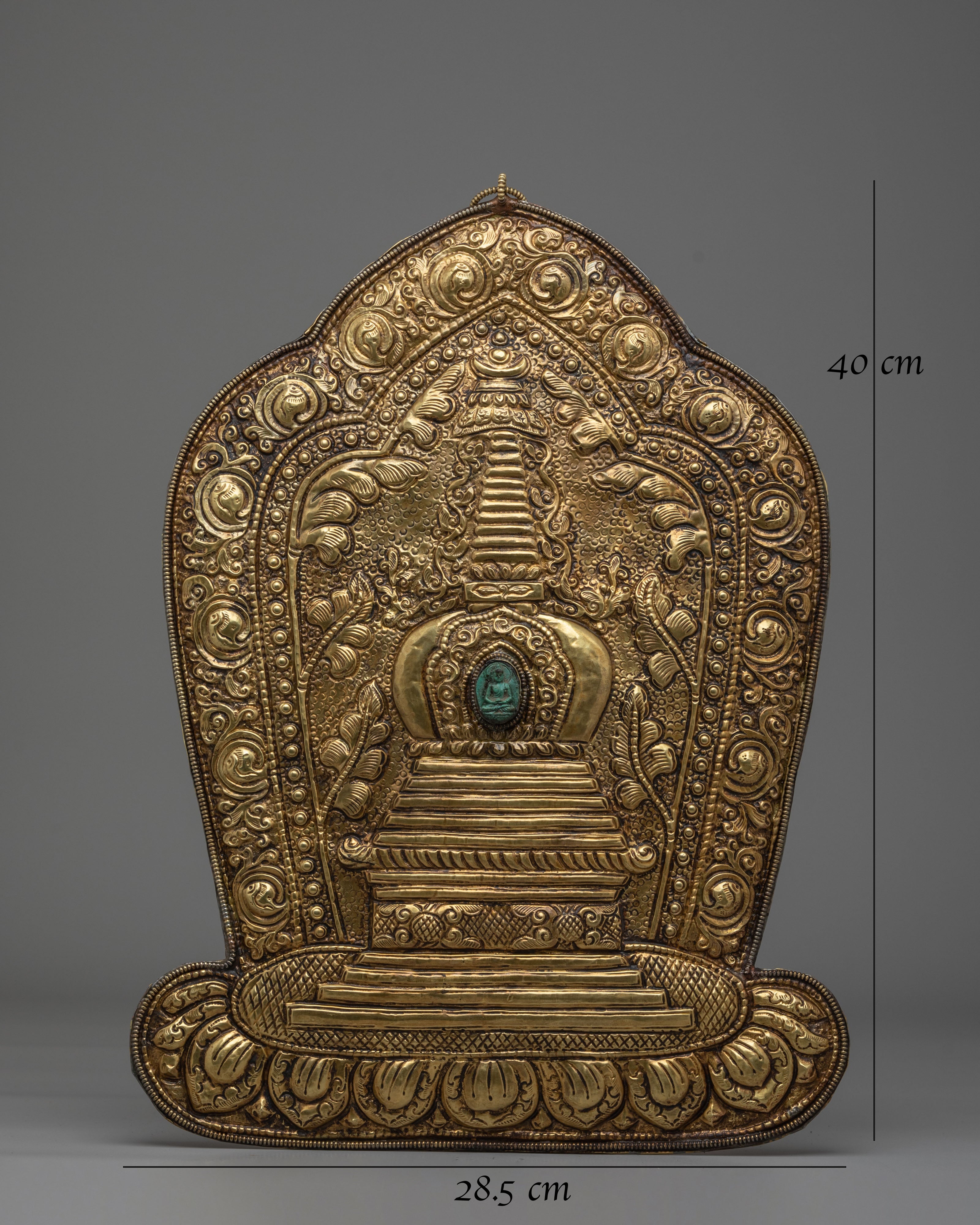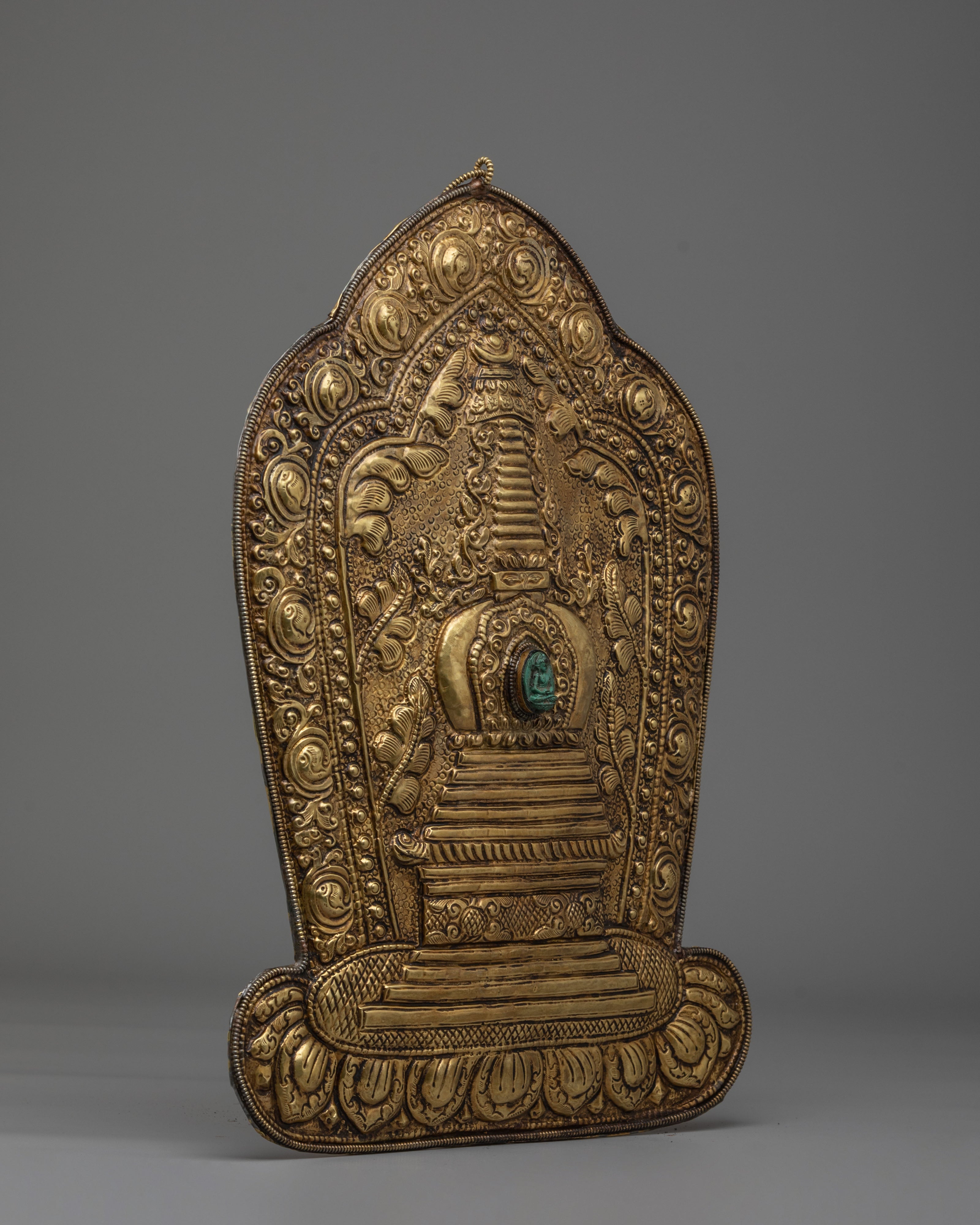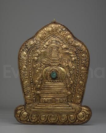 The stupa depicted in this wall hanging represents the enlightened mind and the eternal nature of Buddha’s wisdom. It is often seen as a symbol of refuge and protection in Buddhist traditions. The intricate detailing around the stupa, including the delicate swirling patterns and the green gemstone at its center, adds an element of sacred energy, drawing the viewer's attention to the powerful symbolism of the Buddha’s teachings. This brass piece is not only a work of art but a spiritual object meant to inspire meditation, reflection, and spiritual growth.