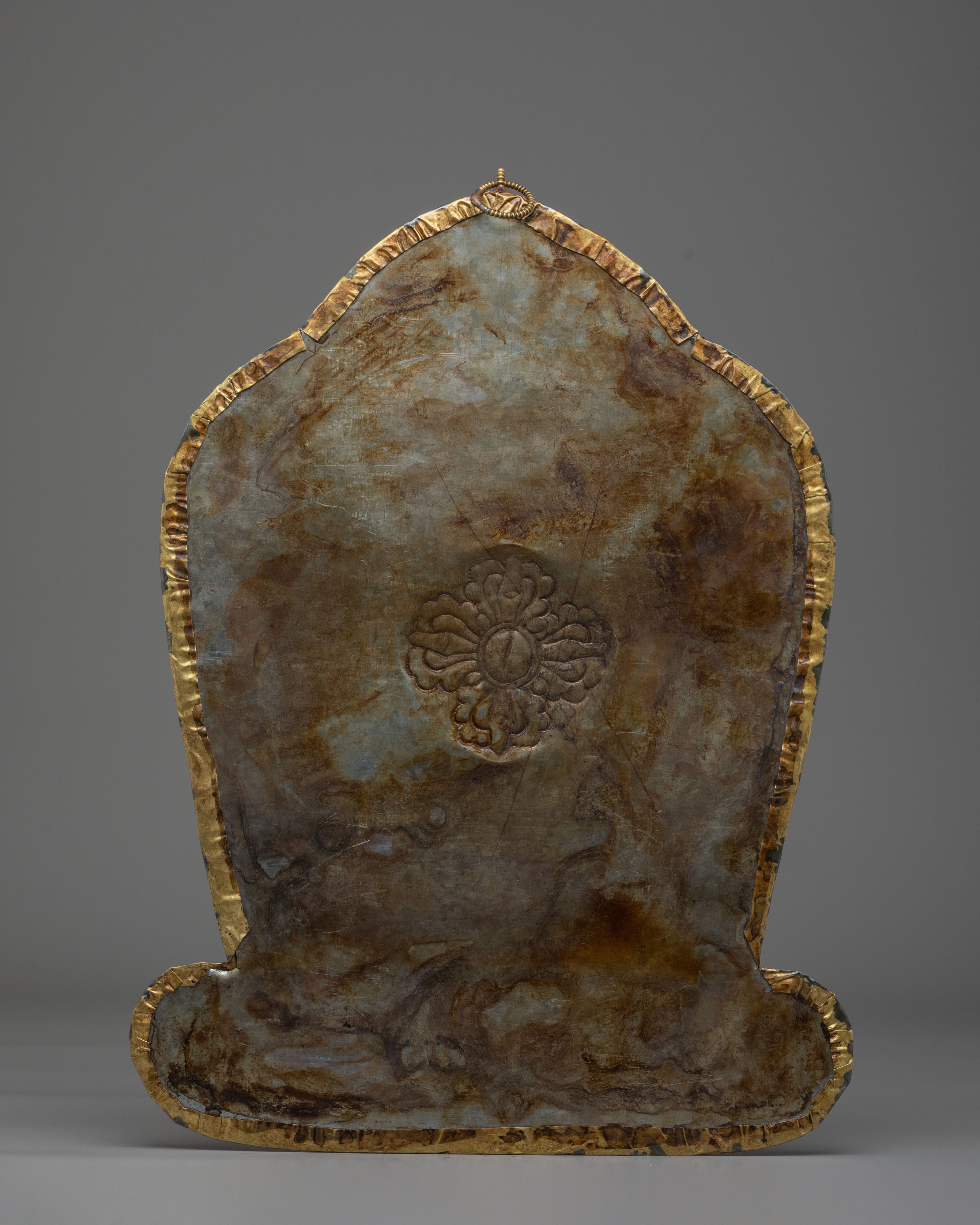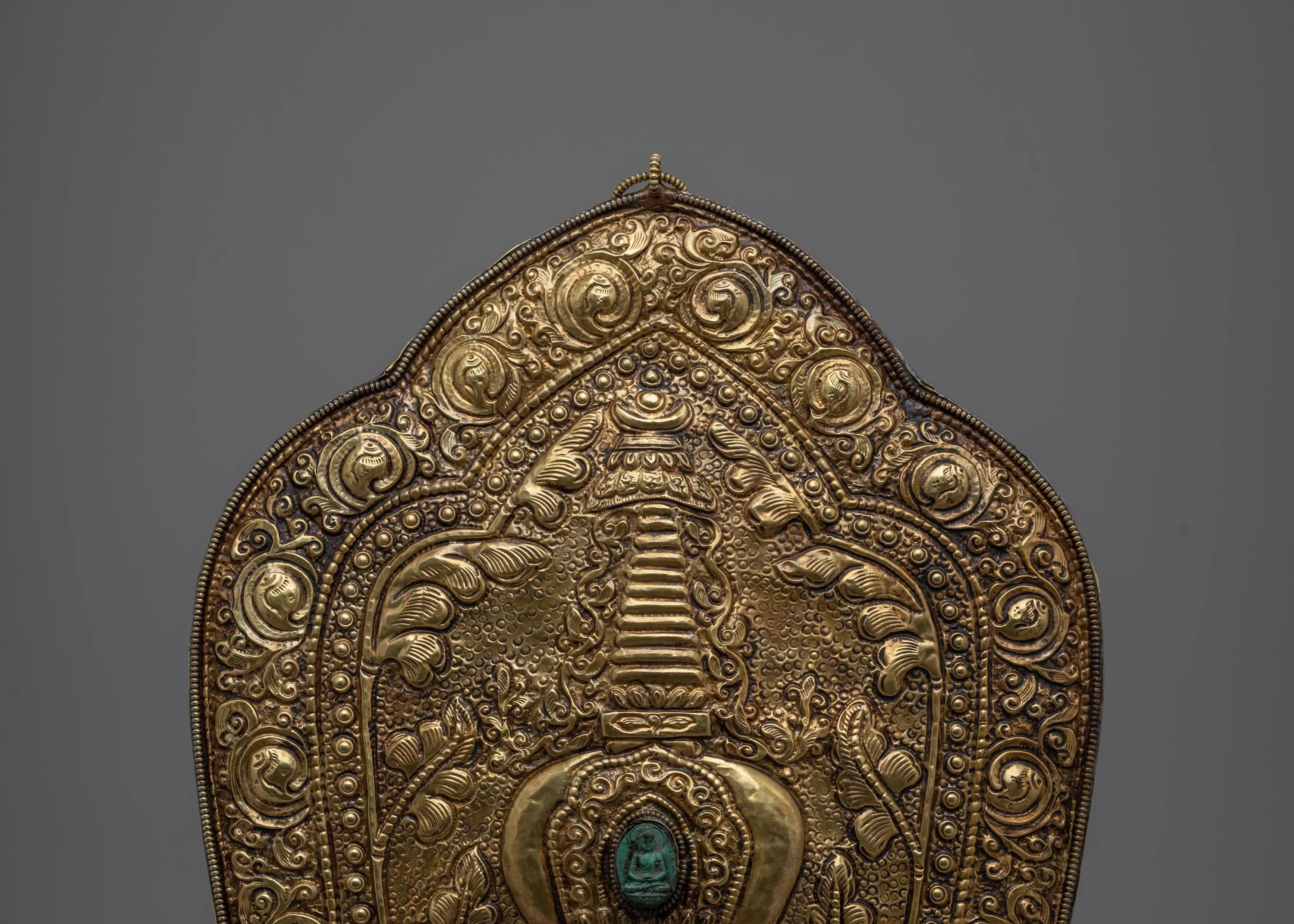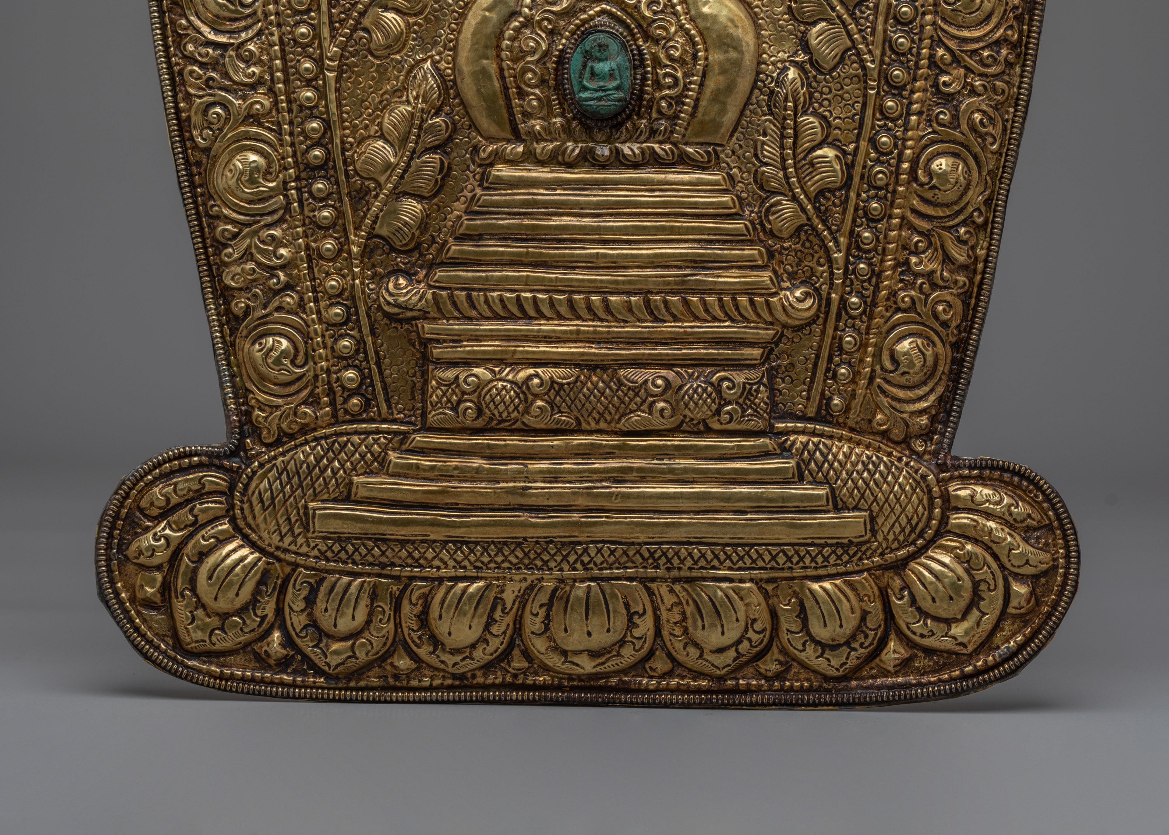 The stupa depicted in this wall hanging represents the enlightened mind and the eternal nature of Buddha’s wisdom. It is often seen as a symbol of refuge and protection in Buddhist traditions. The intricate detailing around the stupa, including the delicate swirling patterns and the green gemstone at its center, adds an element of sacred energy, drawing the viewer's attention to the powerful symbolism of the Buddha’s teachings. This brass piece is not only a work of art but a spiritual object meant to inspire meditation, reflection, and spiritual growth.