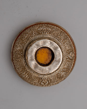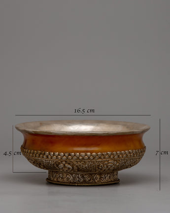 Look at this gorgeous Silver Bowl, which is a work of art in elegance and craftsmanship. It is carefully made from silver and features highlights of yellow jade. It is a magnificent complement to any area thanks to its classic style and high-quality materials. This elegant bowl adds a touch of refinement and beauty to any space, whether it is being used as a serving tray or as a decorative element.