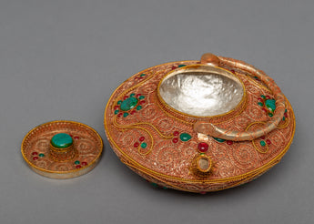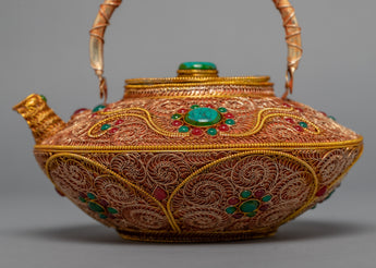This teapot has a copper body that has been handcrafted and beautifully adorned with 24k gold plating and sparkling gemstones. This one-piece adds a touch of luxury to any tea time ritual, making it ideal for tea enthusiasts and collectors. Its intricate design is a testament to our skilled artisans' craftsmanship and attention to detail. With our exquisite teapot, you can enjoy your favorite tea blends while immersing yourself in the peaceful ambiance of the Buddhist tradition.