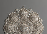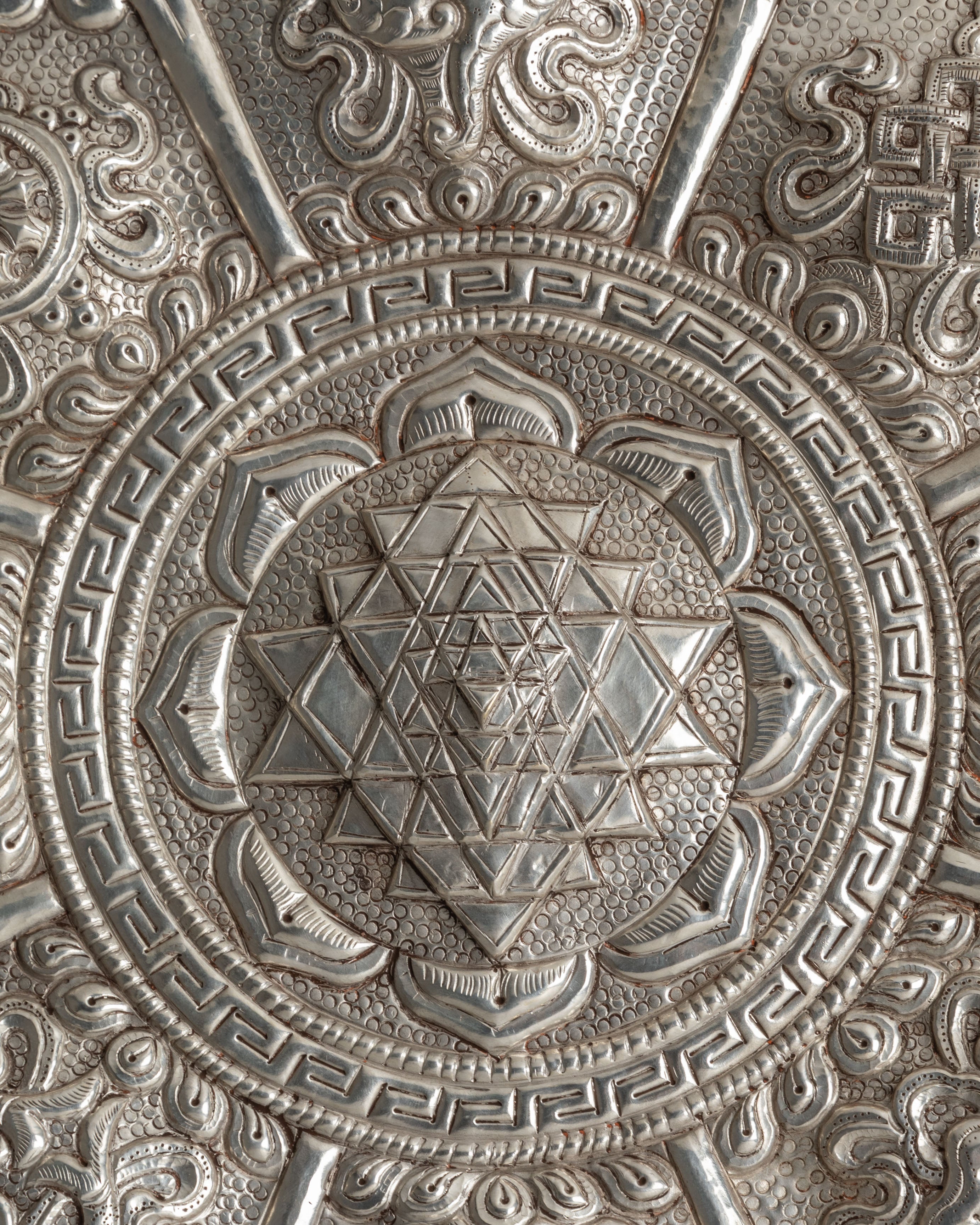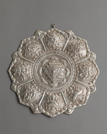The intricate design features the central Sri Yantra, composed of interlocking triangles that represent universal creation and inner balance. Surrounding the core geometry are detailed lotus petals and traditional motifs symbolizing purity, expansion, and higher consciousness. Each petal section includes ornate carvings of floral elements and sacred symbols, all meticulously crafted to reflect the spiritual significance and artistic heritage of Himalayan metalwork. The silver-plated surface enhances every detail, giving the piece a striking, refined look.
