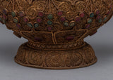 The teapot is a magnificent display of expert craftsmanship and intricate design. The pot is entirely handcrafted from the finest materials, with a copper body plated with 24K gold for a luxurious finish. The pot is then adorned with stunning gemstones that are carefully inlaid to create a stunning impact. One of the pot's most striking features is its intricate floral designs, which add a natural beauty to its overall appearance.