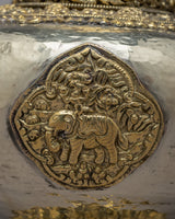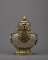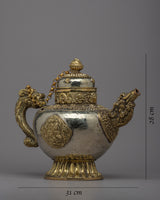 Our Tibetan Tea Pot Kettle, painstakingly made by talented artisans from white metal and brass, is a magnificent fusion of history and beauty. Standing at a height of 28 cm and weighing 2.256 kg, it represents ageless beauty and cultural legacy. Even though its main purpose may be decorative, its fine detailing and complex design make it a captivating focal point in any space.