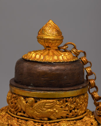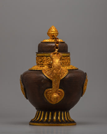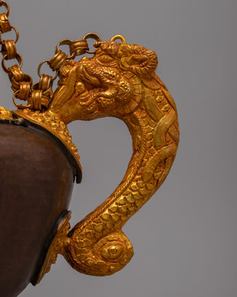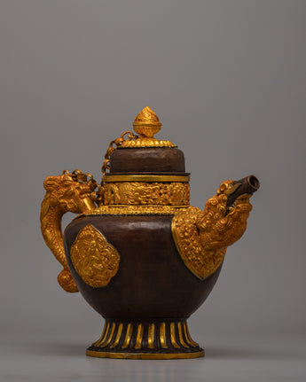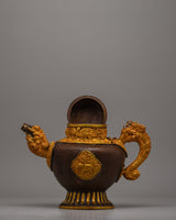 This 2.58 kg tea pot is a classic addition to any home or shrine because it is attractive and long-lasting. The symbolic themes instill a sense of devotion and calm, while the brilliant gold plating and intricate creativity will awe the viewer. This Tibetan Buddhist tea pot is a wonderful way to add a touch of holy tradition and spiritual energy to your room, whether it is used in rituals, displayed as a centerpiece, or given as a present to a loved one.
