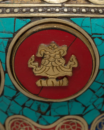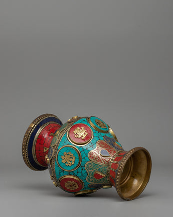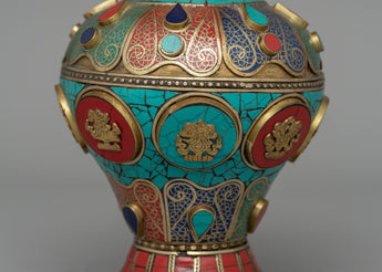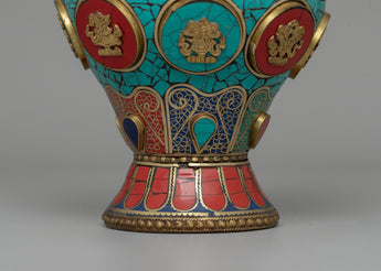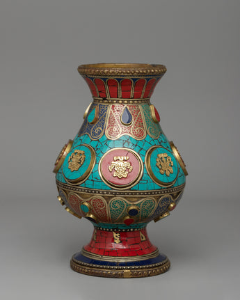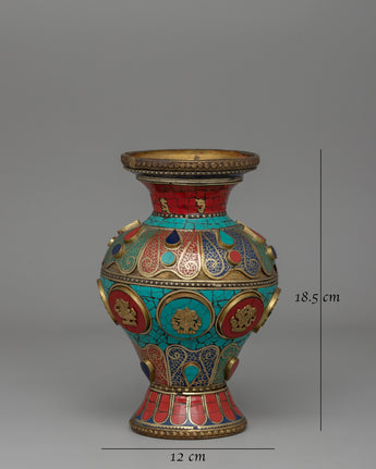This handcrafted Tibetan Flower Vase with Brass is a stunning combination of tradition and skill. This 60-cm-tall vase, made of brass and copper, is delicately embellished with colorful coral, turquoise, and Artificial Stones, resulting in a stunning exhibition of sacred Buddhist art. Inspired by Tibetan and Himalayan aesthetics, this vase is more than just a decorative piece; it represents prosperity, spirituality, and cultural heritage.