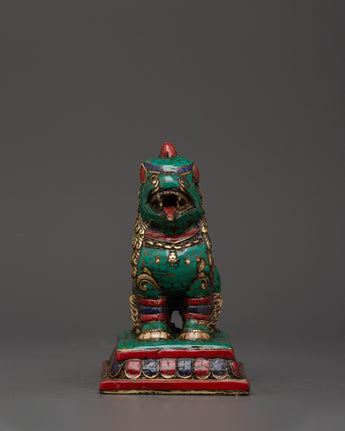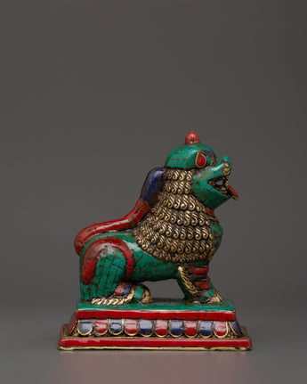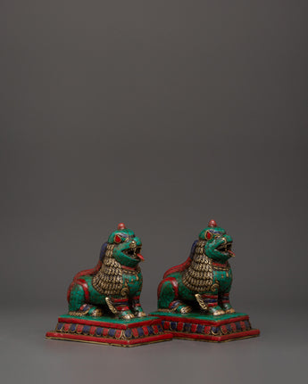 Tibetan Lion Set Brass Guardian Statues | Inlaid with Coral & Turquoise | Spiritual Protector