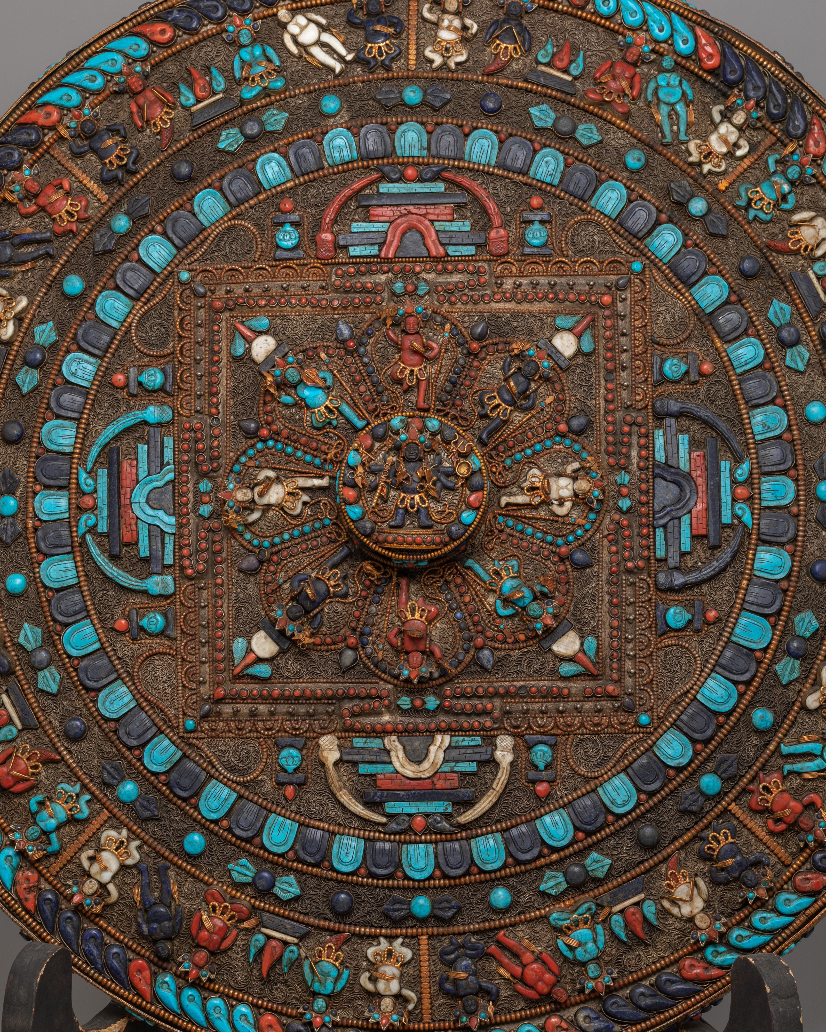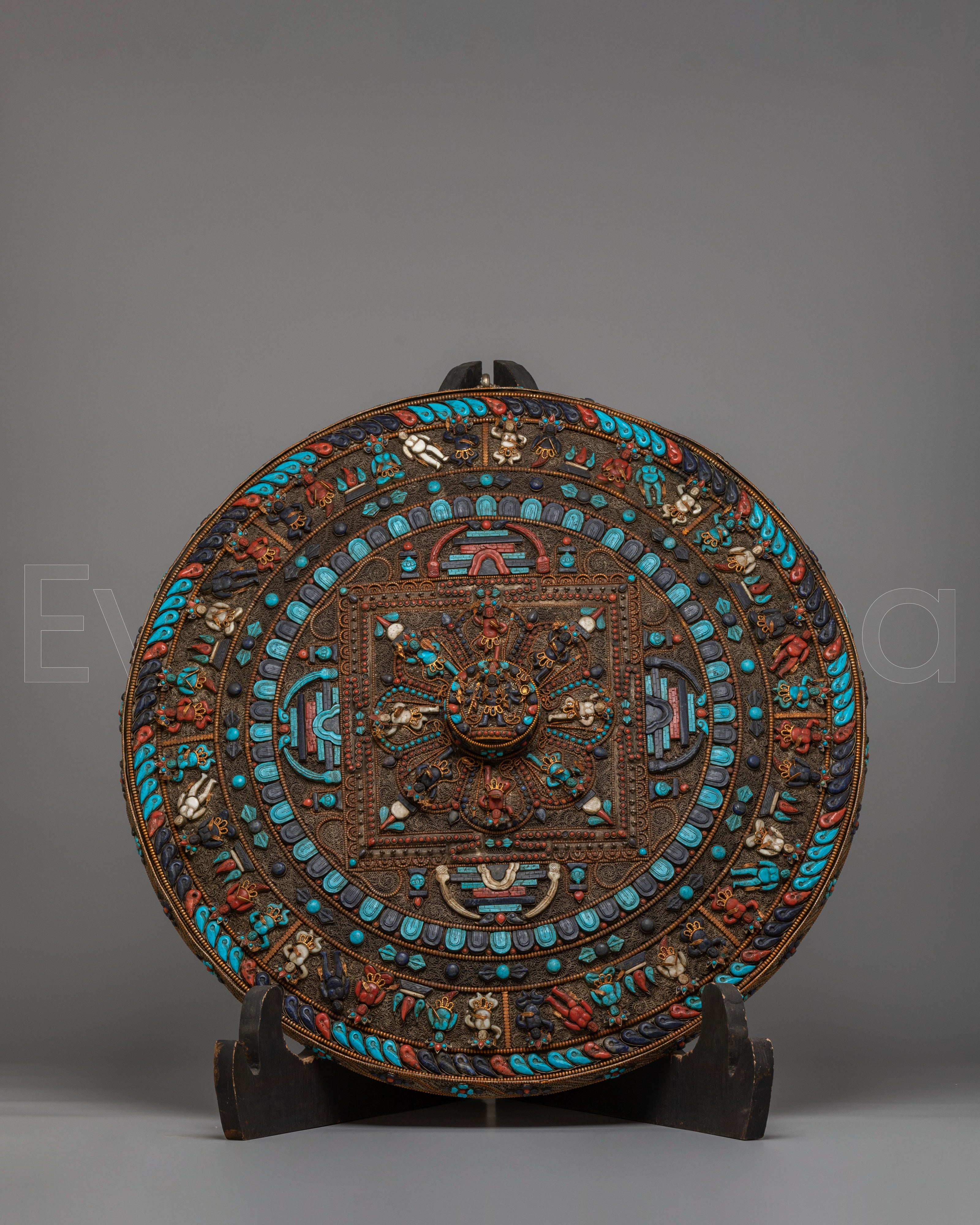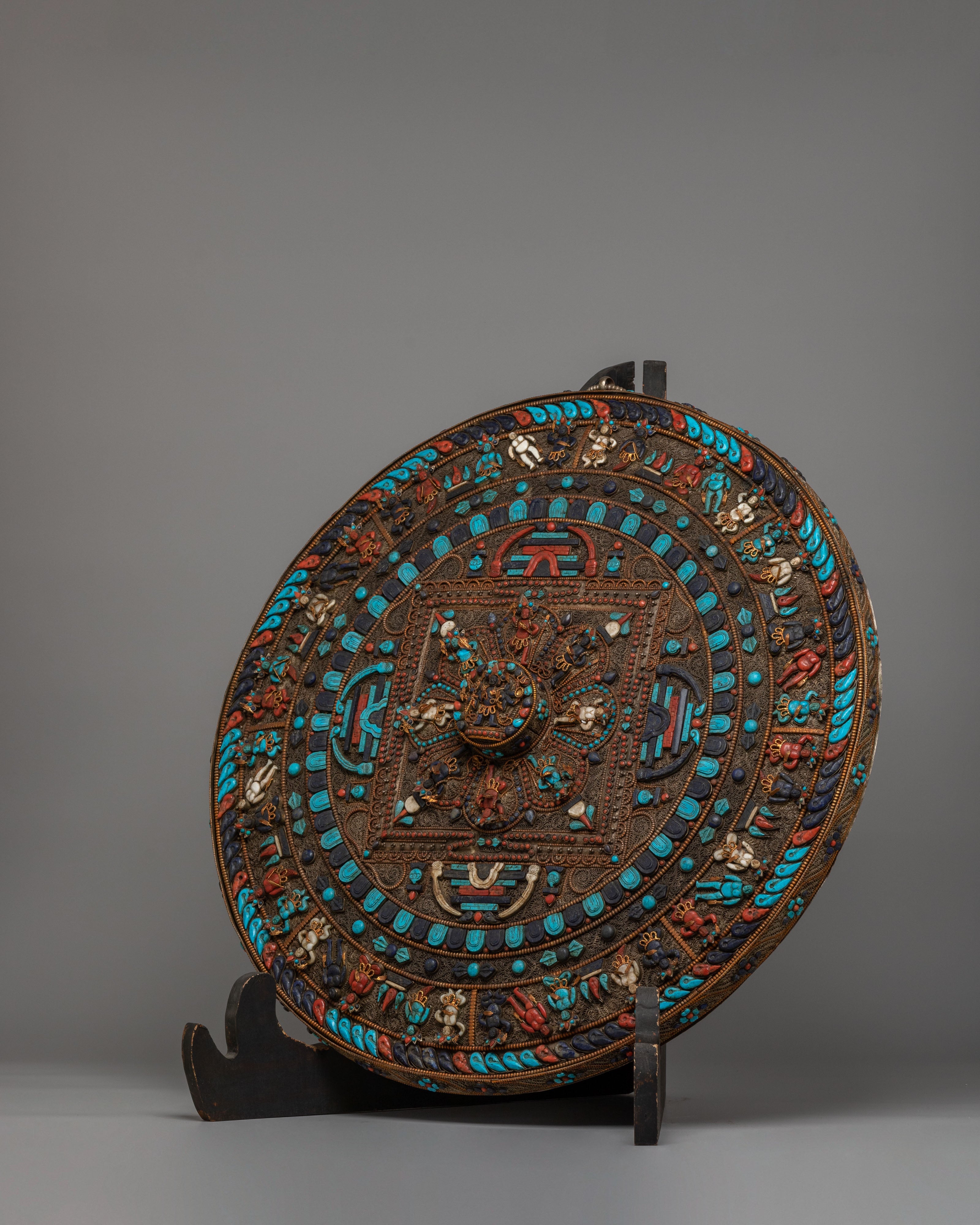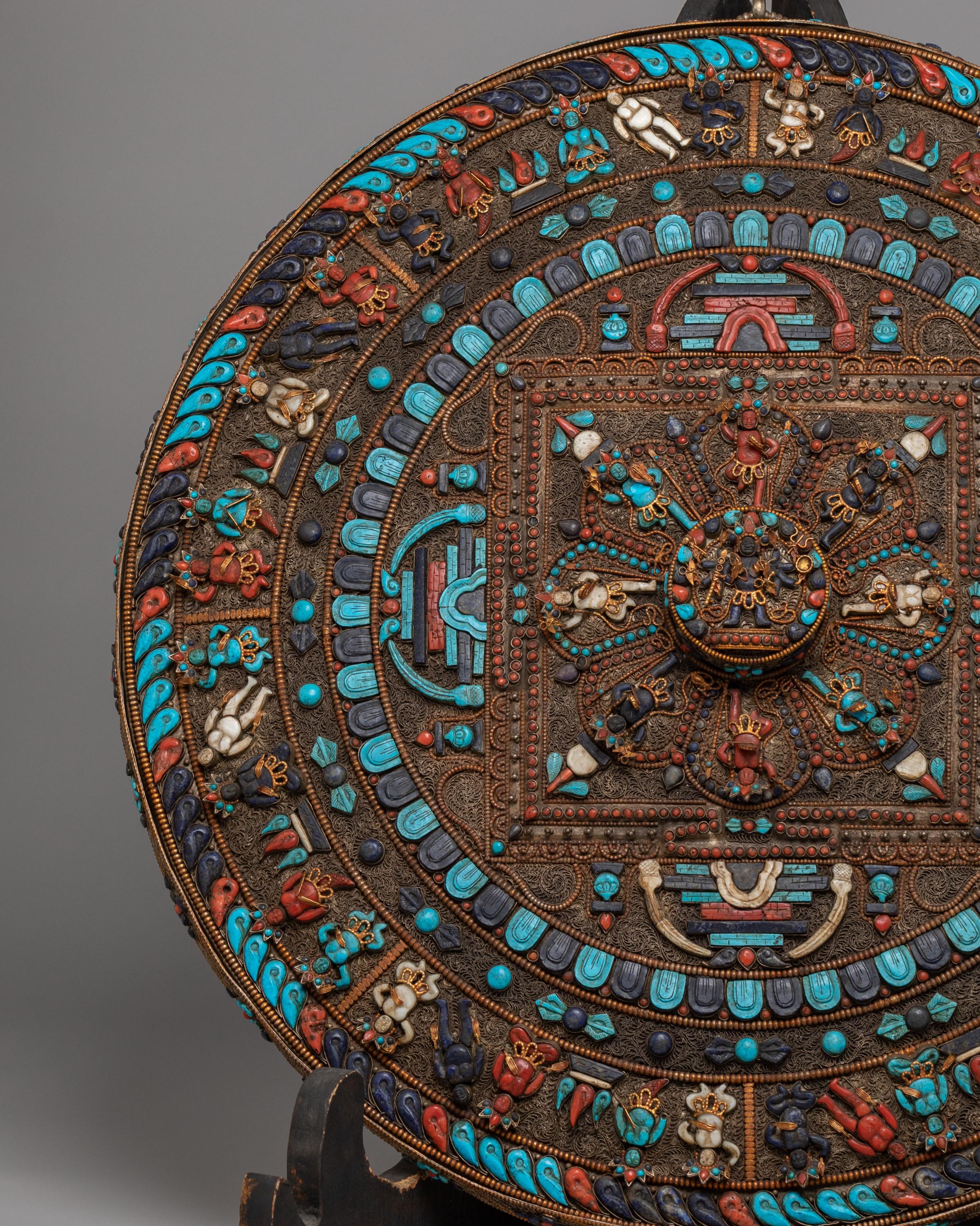 Perfect for meditation rooms, yoga studios, altar spaces, or serene home décor, this Tibetan gemstone mandala wall hanging brings an atmosphere of peace and elevated energy into any environment. As a meaningful expression of spiritual unity and protection, this silver-plated copper mandala art piece serves as a distinguished focal point. Ideal for admirers of Himalayan Buddhist art, gemstone wall décor, Lapis Lazuli mandalas, and handcrafted spiritual home accents, it transforms your wall into a sanctuary of beauty and contemplation.