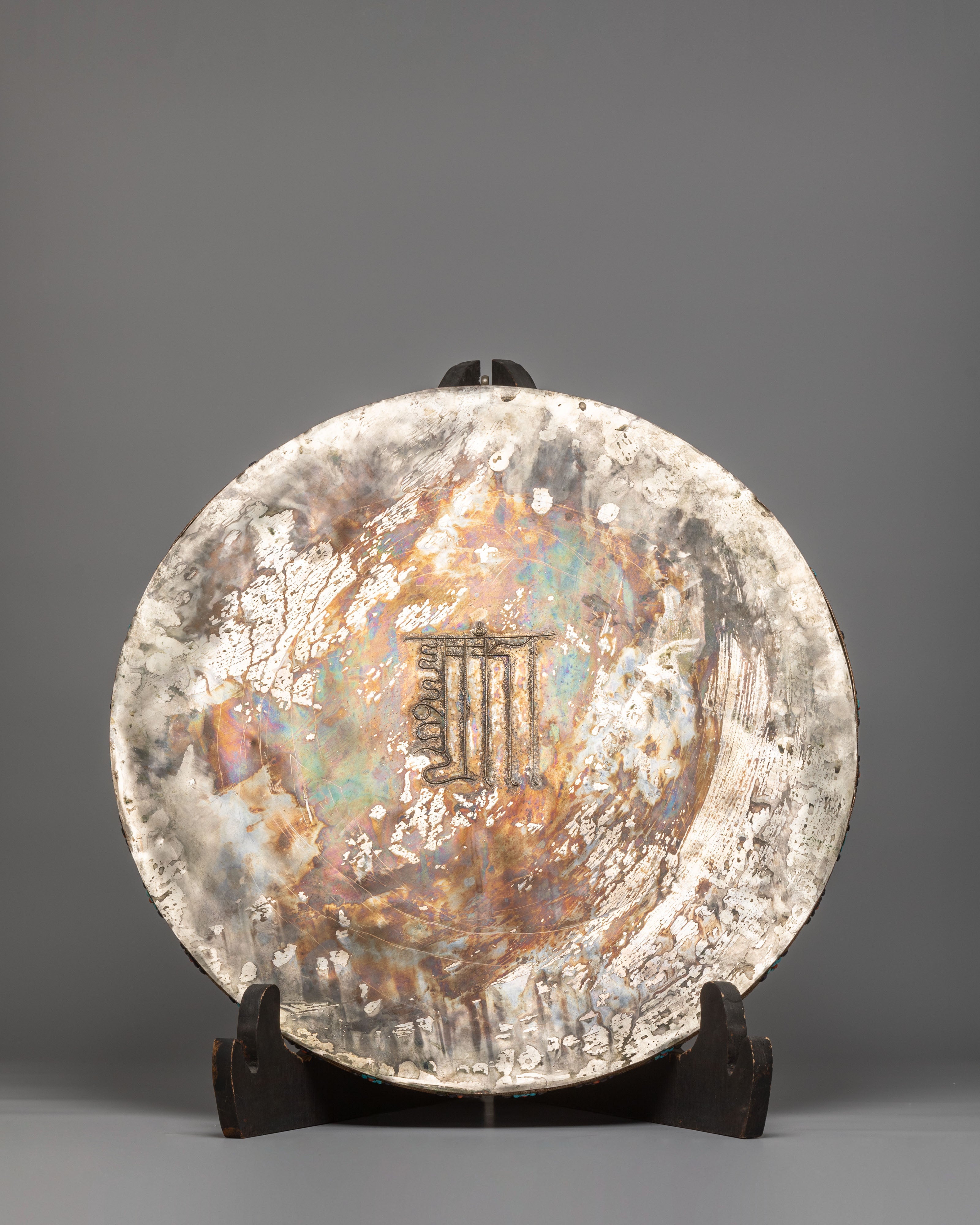 This Handmade Tibetan Mandala Wall Art is crafted from a copper base with silver plating, beautifully inlaid with natural stones and genuine Lapis Lazuli. The intricate carving inside the stone reflects Himalayan craftsmanship, where each detail is carefully hand-finished by artisans. The combination of silver tones and blue lapis creates a visual harmony, making this gemstone mandala both a sacred art piece and a décor element. Its structure enhances its presence, giving it a powerful yetenergy suitable for spiritual interiors.