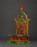 This Buddhist deity throne, whether used on a home altar, in a meditation area, or at a temple, embodies Himalayan craftsmanship and spiritual significance. This handcarved shrine stand is ideal for supporting Buddha statues, ceremonial artifacts, or symbolic offerings. It combines spiritual symbolism with practical usefulness. Allow this Tibetan ritual furniture, including a wooden altar seat and a colorful spiritual throne, to enhance the visibility of your spiritual practice.