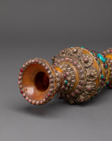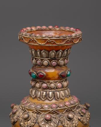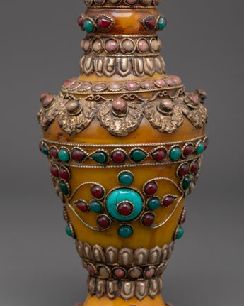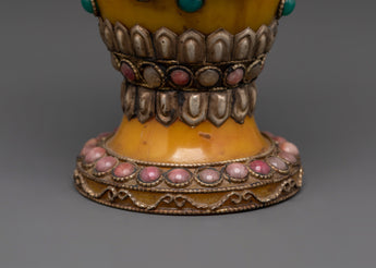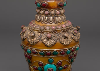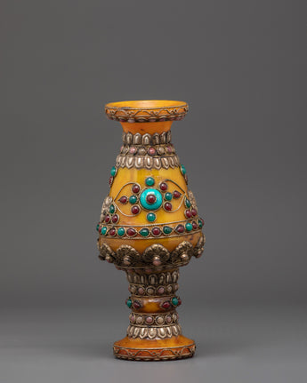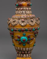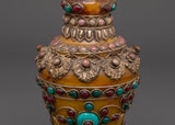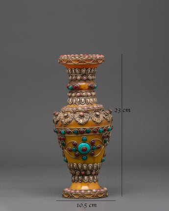 This stunning vase weighs 0.53 kilograms and has intricate hand-etched detailing on its metal body. The vibrant stones, which represent wisdom, healing, and inner peace, are arranged in traditional Tibetan motifs inspired by centuries of sacred design. The vase's polished finish gives it an antique appearance, increasing its value as both a decorative item and a spiritual tool.