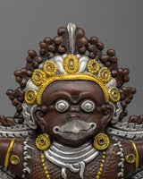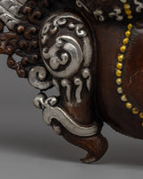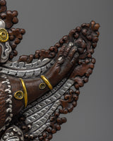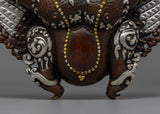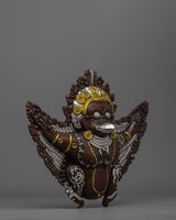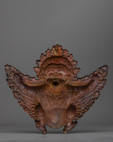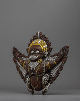 A remarkable work of spiritual and home décor, the Complete Garuda Wall Hanging is modeled after the Tibetan Buddhist Protector Deity Garuda. This wall hanging, made of oxidized copper with intricate detailing throughout and plated in electro gold and electro silver, represents the celestial guardian renowned for driving away evil spirits and for standing for transcendence and highlighting the figure's divine nature, bravery, and independence. Its elaborate design, with exquisite details that amplify its potent visual appeal, reflects traditional Tibetan craftsmanship. Wings are spread wide, and the feather and body carvings show incredible attention to detail, giving the figure a majestic, powerful appearance.